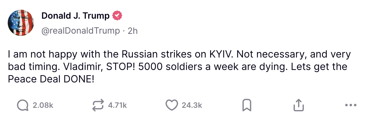 特朗普在Truth Social上發文“弗拉基米爾,住手!”並非結束戰爭之道——彭博社