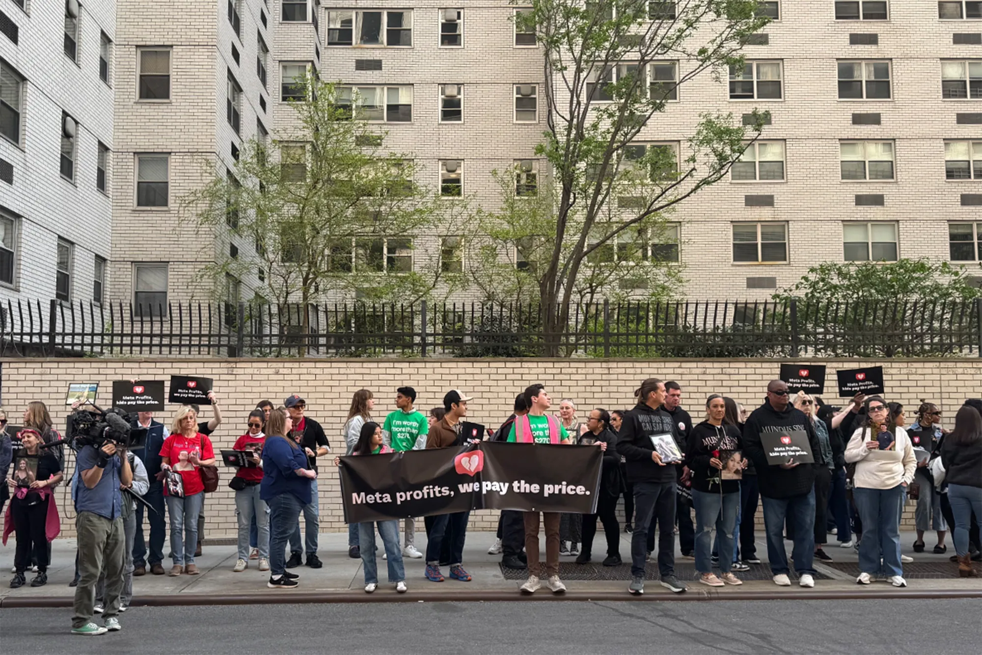 “Meta盈利;孩子付出代價。“這是週四早上三十多位失去孩子的父母在紐約Meta總部前傳達的信息。
