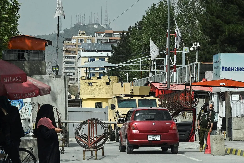4月17日,一名塔利班安全人員在喀布爾俄羅斯大使館入口處檢查車輛。攝影師:Wakil Kohsar/AFP/Getty Images俄羅斯總統弗拉基米爾·普京將阿富汗塔利班稱為反恐"盟友"近一年後,莫斯科解除了對該組織長達二十年的禁令,旨在加強與喀布爾的關係以共同敵人——伊斯蘭國。