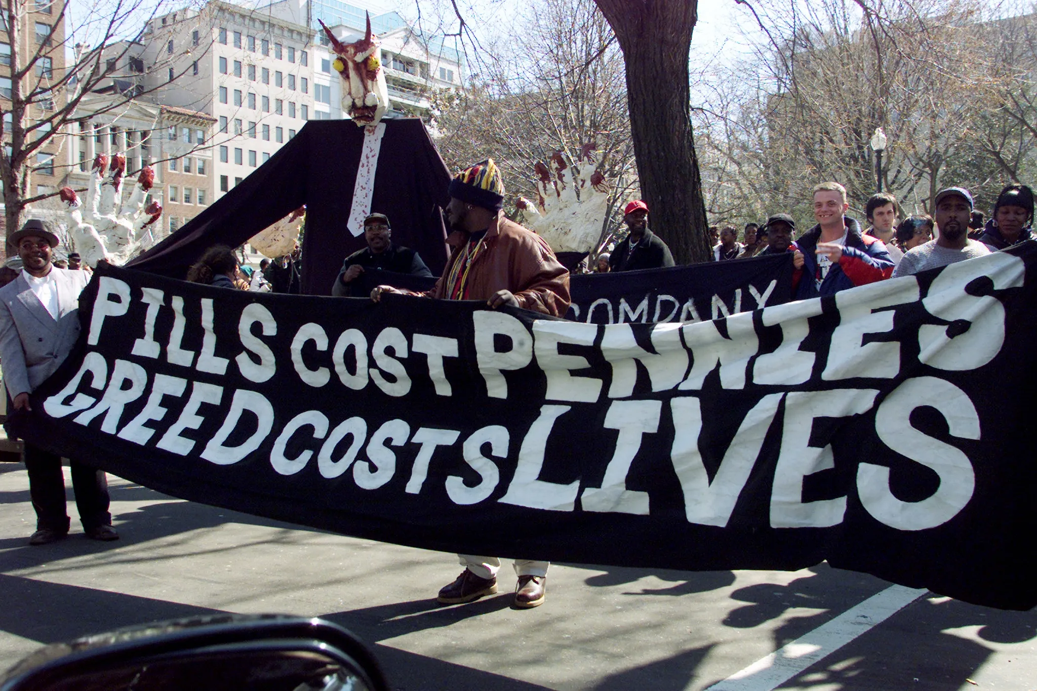 2000年,在華盛頓特區的一次示威活動中,抗議者呼籲製藥公司以更低的價格在南非銷售艾滋病藥物。攝影師:紐約每日新聞檔案/蓋蒂圖片社特朗普1月20日簽署的行政命令凍結對外援助支出90天,導致全球援助領域陷入混亂,而像總統艾滋病緊急救援計劃(Pepfar)等關鍵項目的未來資金仍懸而未決。該計劃由喬治·W·布什於2003年創立,是任何國家針對單一疾病做出的最大規模承諾,目前支持着全球約90%的艾滋病預防用藥(PrEP)新使用者。