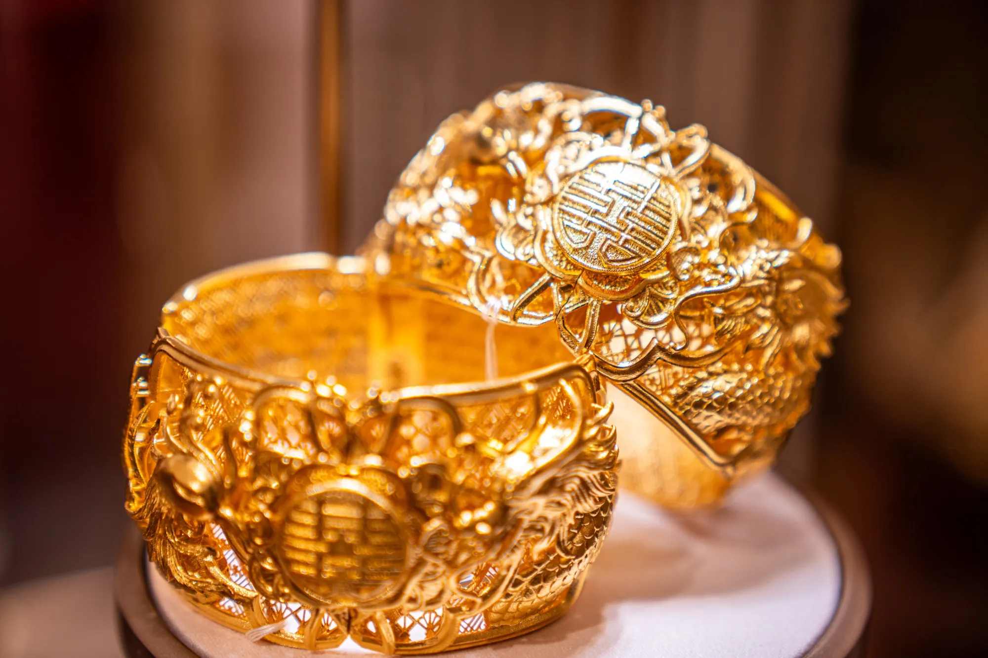 2024年9月9日,香港周大福珠寶集團門店展示的黃金手鐲。攝影師:林易/Bloomberg除市場波動外,黃金持有在印度和中國文化中根深蒂固——這兩個全球最大的黃金市場將珠寶、金條等形式的黃金作為傳家寶,象徵着繁榮與安全。印度家庭持有約2.5萬噸黃金,是諾克斯堡美國金庫儲量的五倍多。