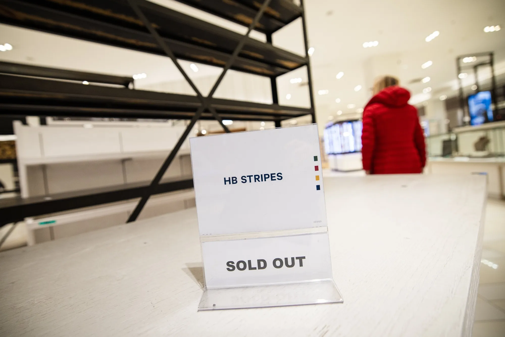 3月20日,Hudson’s Bay Sherway Gardens的HB Stripes商品售罄。攝影師:Nick Lachance/多倫多星報/Getty Images“我們的團隊付出了巨大努力尋找可行的發展路徑,顧客和員工們分享的關於Hudson’s Bay的感人故事——我們的門店對他們、他們的家庭以及幾代社區的意義——給予我們莫大的支持,HBC首席執行官Liz Rodbell在法庭程序前的一份聲明中表示。