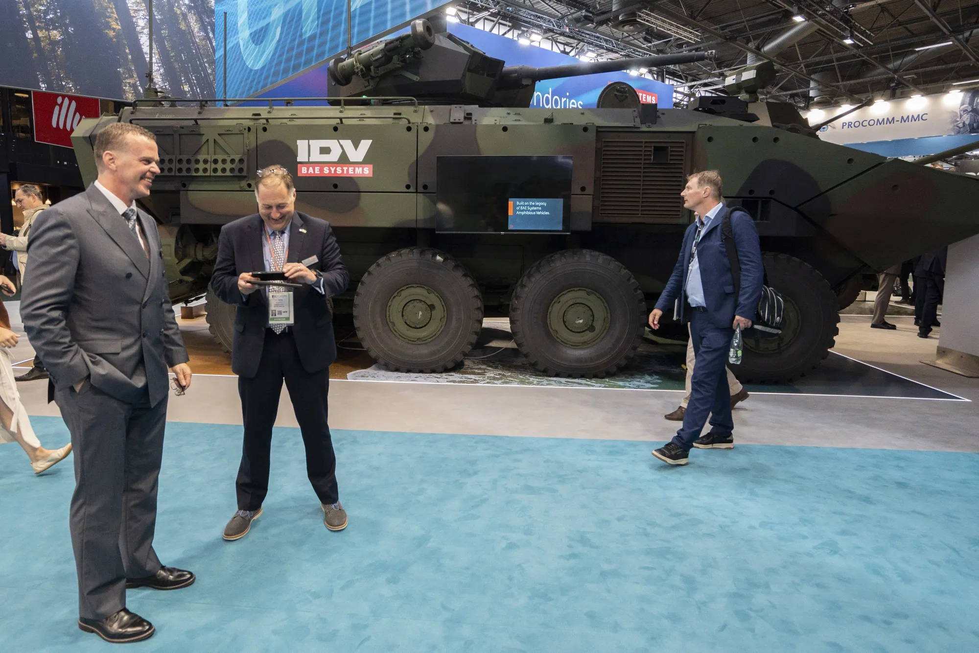 2024年6月18日星期二,法國巴黎歐洲國際防務展上,BAE系統公司與依維柯防務車輛公司標識共同出現在一輛兩棲作戰車輛上。