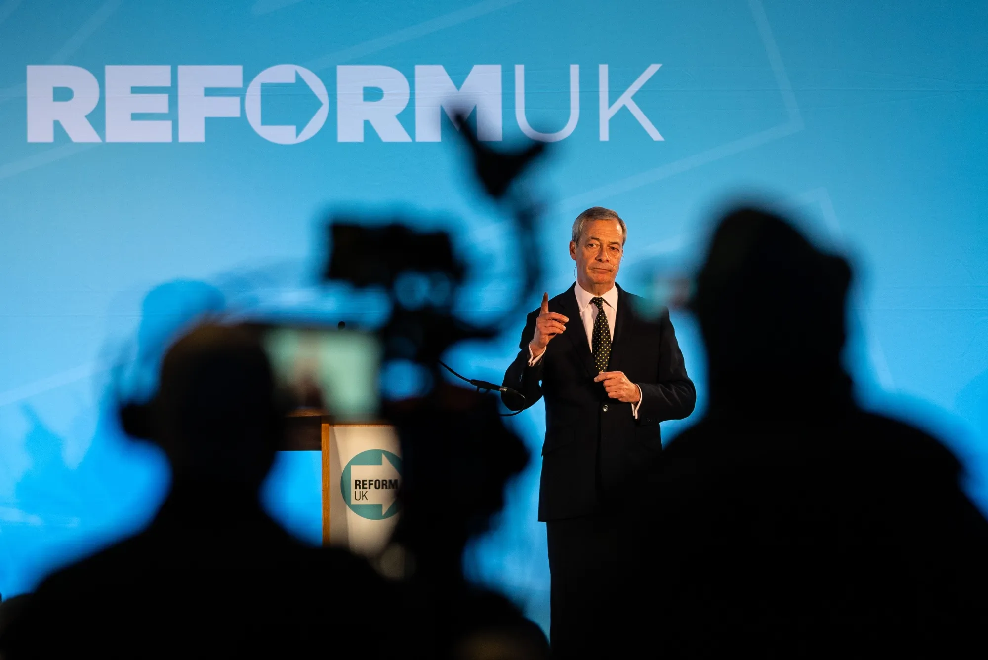 奈傑爾·法拉奇1月10日在埃舍爾舉行的改革黨東南地區會議上發表講話。圖片來源:蓋蒂圖片社新興的英國改革黨已成為英國政壇的重要競爭者。