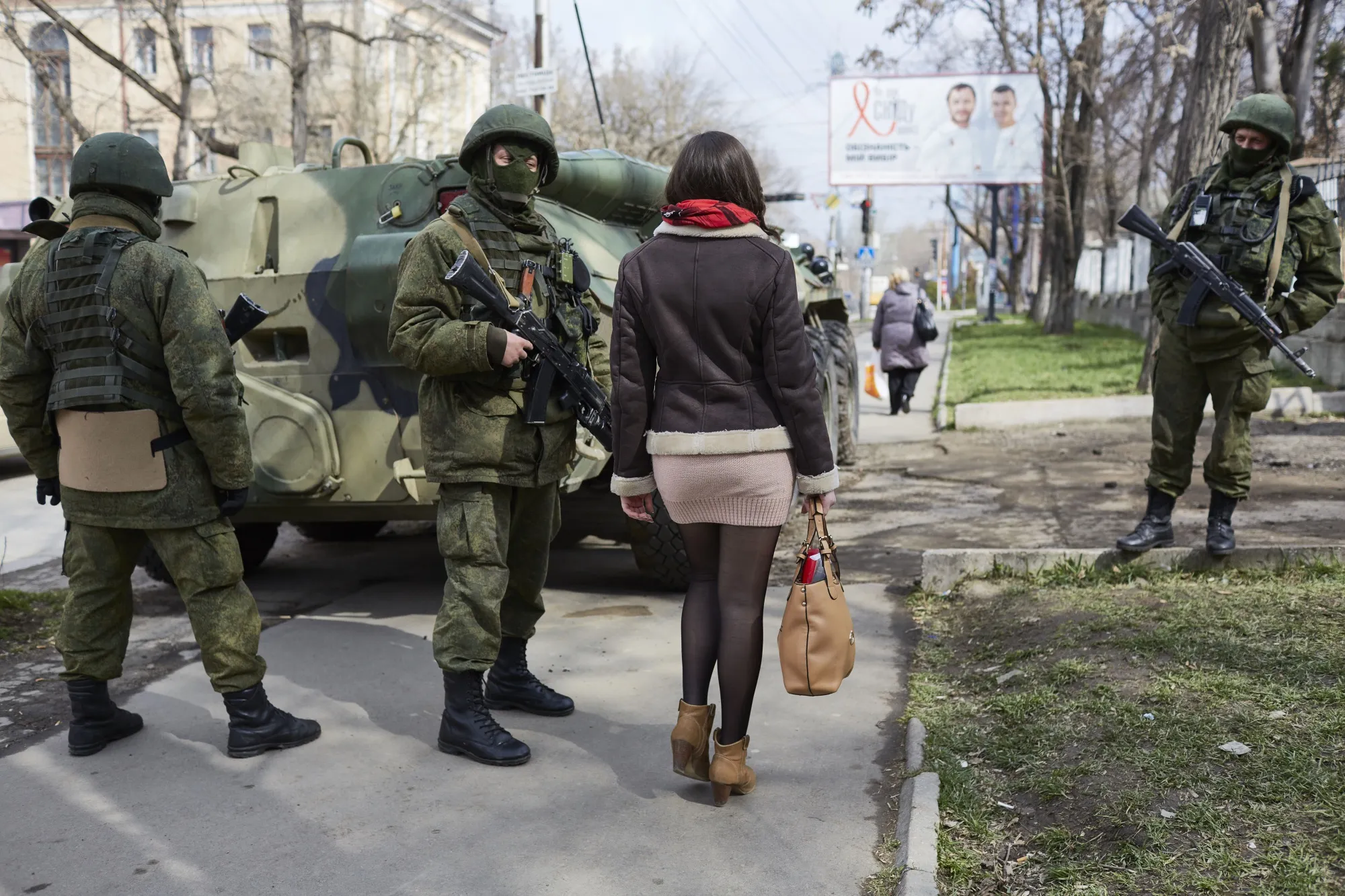 2014年,俄羅斯軍人在克里米亞辛菲羅波爾一處烏克蘭軍事基地外。
