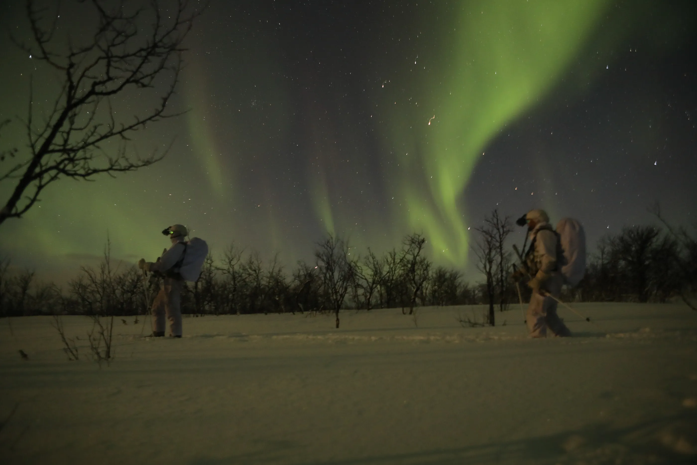 挪威軍演上空的北極光。圖片來源:挪威武裝部隊攝影師:圖片來源:挪威武裝部隊。挪威北部山區的深夜,一隊士兵正悄然滑向敵軍目標。極寒耗盡了巡邏隊長夜視鏡的電池,滑雪板也凍得僵硬難以操控。室外零下37攝氏度(華氏零下34.6度),風寒效應更添刺骨。作為測試北極環境對裝備、身心影響的演習,他們的任務是生存100天。