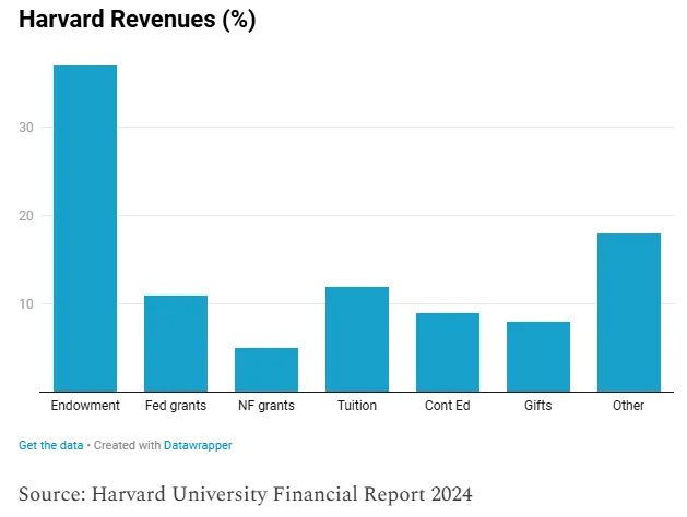 學費收入已面臨威脅。若再失去聯邦撥款,這些院校恐怕只能依賴其鉅額捐贈基金。理論上這完全不成問題。根據《華爾街民主黨人》通訊披露,以下是哈佛大學資金來源構成: