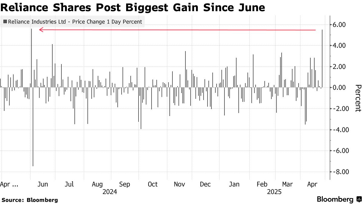 信實工業有限公司股價創下自6月以來最大漲幅,這家涵蓋煉油至零售業務的印度巨頭公佈的第四季度收益超出市場預期。