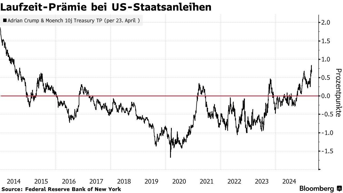 唐納德·特朗普圖片來源:Jim Lo Scalzo/EPA/彭博社日益增長的不確定性正促使投資者重新審視美國國債的傳統安全評級。對於長期債券,他們已要求更高收益率。目前所謂的"期限溢價"(投資者要求的風險補償)已達到2014年以來的最高水平。