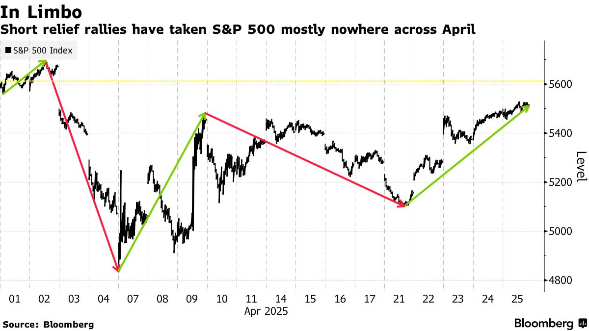 但華爾街正因關税政策的瞬息萬變而劇烈震盪,並對經濟數據可能惡化感到不安,他們發現這套經驗法則已然失效——即便標普500指數已從2月峯值回升近半數跌幅。
