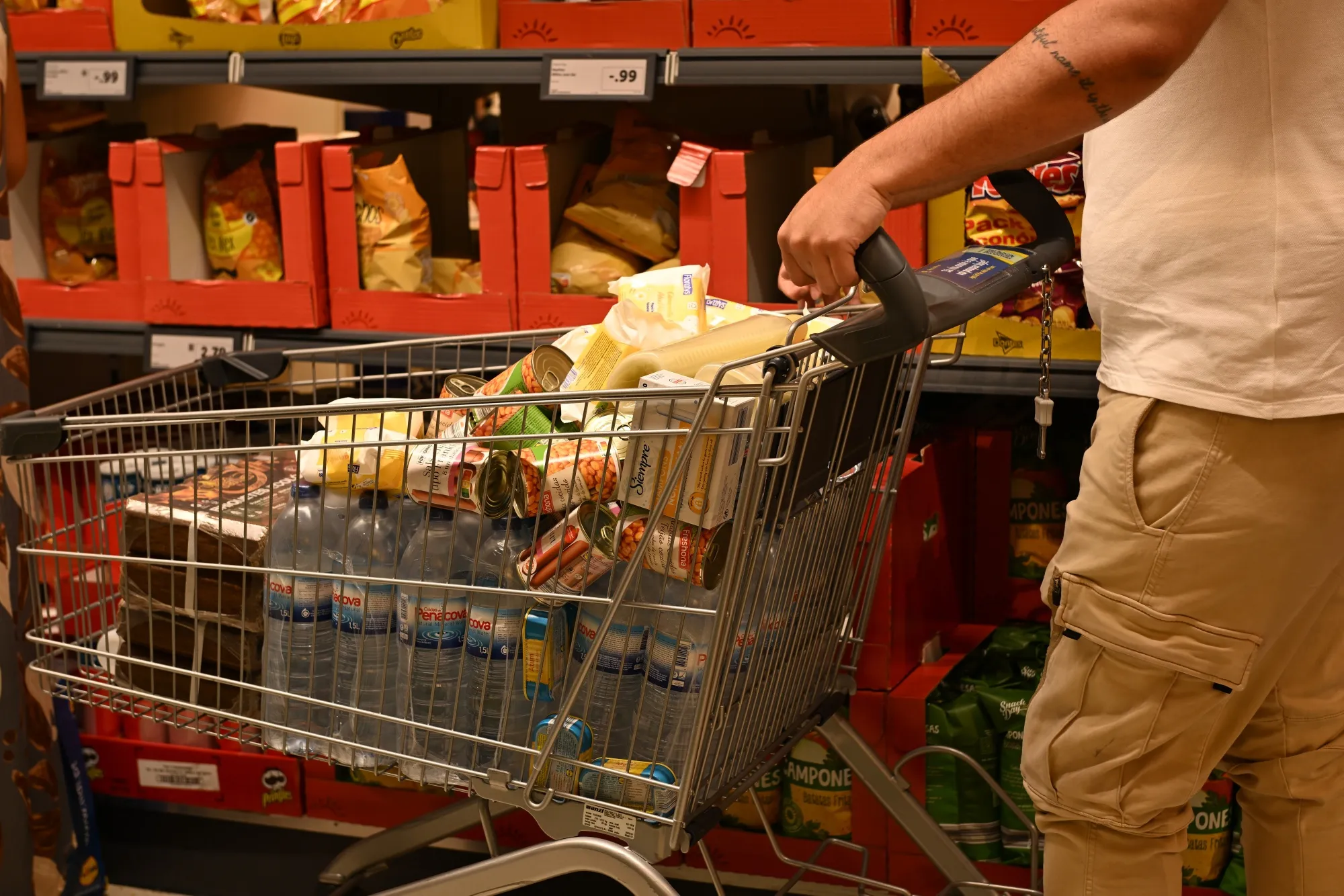 由於電力中斷,週一西班牙和葡萄牙大部分地區的公共交通、交通信號燈和電話服務陷入癱瘓,列車也基本停運。圖為里斯本一家超市內顧客搶購水和物資的場景。