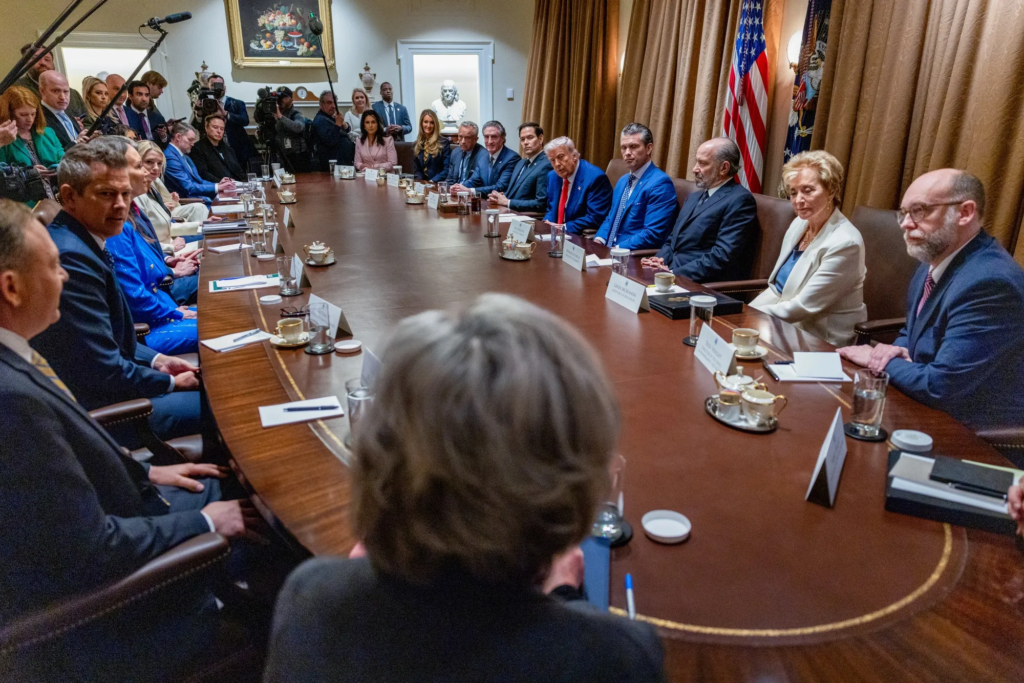 4月16日,唐納德·特朗普(中)在白宮參加內閣會議。攝影師:肖恩·休/EPA/彭博社據該顧問透露,特朗普一直專注於白宮工作,其高效工作節奏讓民眾深知他的忙碌,並強調內閣官員已在全國巡訪並接受地方媒體採訪。