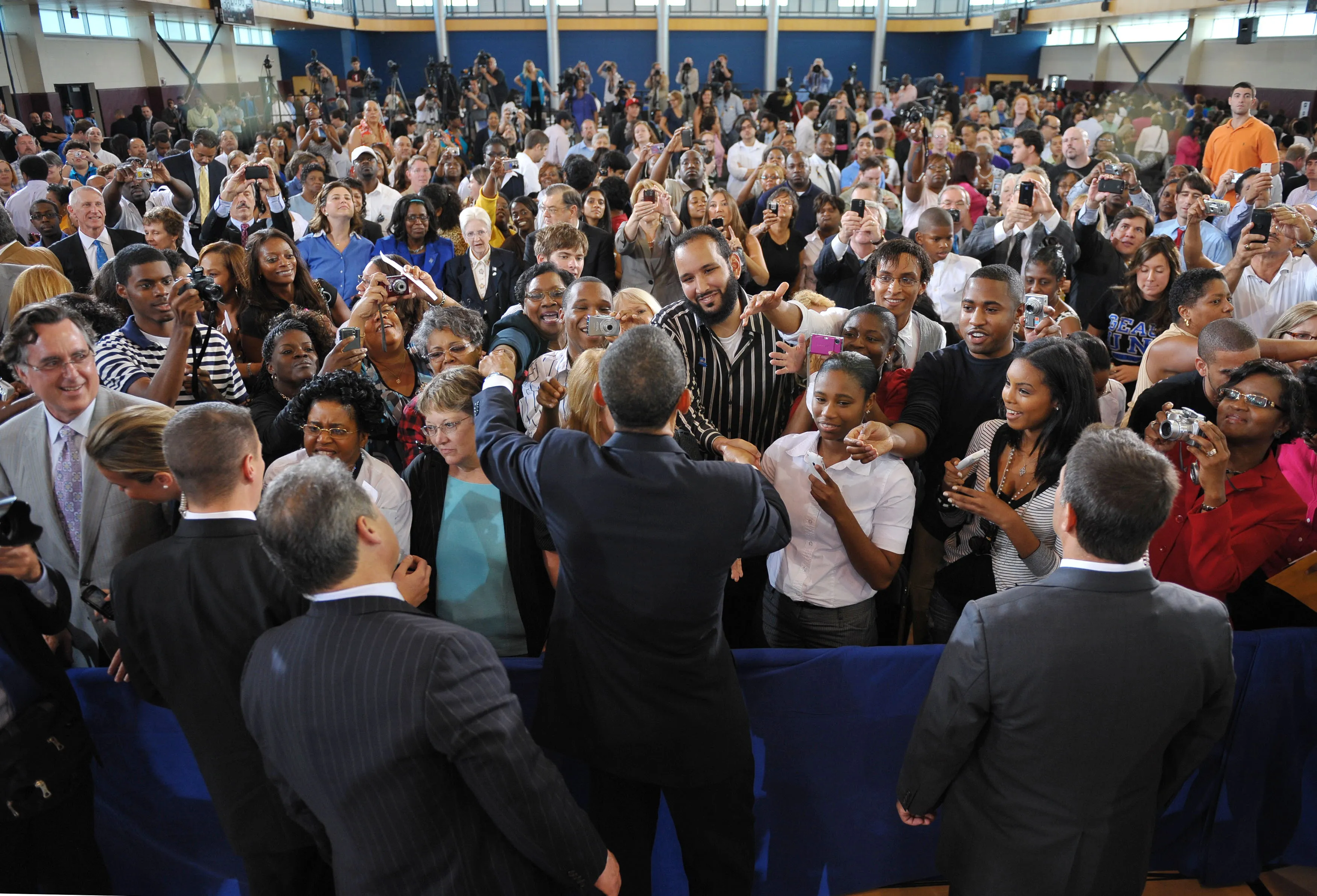 2009年10月15日,巴拉克·奧巴馬在新奧爾良市政廳活動後向與會者致意。攝影師:曼德爾·恩甘/法新社/蓋蒂圖片社奧巴馬曾走遍全國會見民眾,推動其經濟復甦計劃與醫療改革。根據克諾勒的數據,在其執政第一年的相同時段內,他至少進行了10次出行,包括市政廳會議和建築工地視察。這還不包括戴維營行程或外訪活動。奧巴馬沒有私人度假房產,只在芝加哥家中度過一個週末。