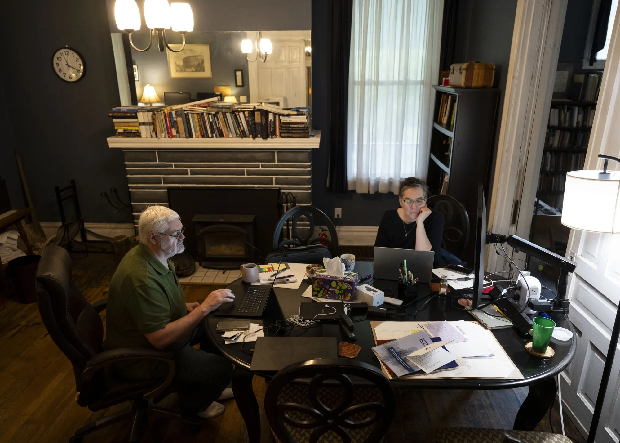 傑裏·鮑耶與妻子蘇珊在餐桌旁工作。攝影師:內特·斯莫爾伍德/彭博社這些看似晦澀的專業議題,實則對設定企業優先級至關重要。美國證券法要求上市公司召開年度會議,讓股東審議公司經營。數千家基金管理人代表數百萬投資者,就高管薪酬到環境社會相關披露等議案進行數十億次投票表決。