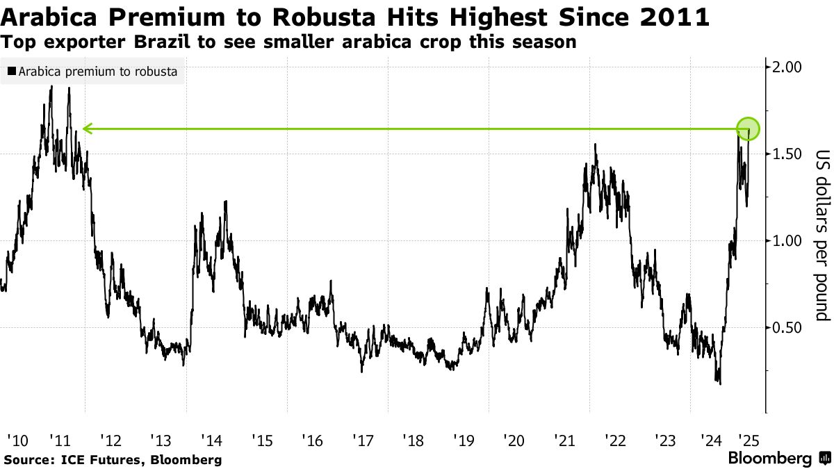 阿拉比卡咖啡對羅布斯塔的溢價因供應趨緊而攀升——彭博社