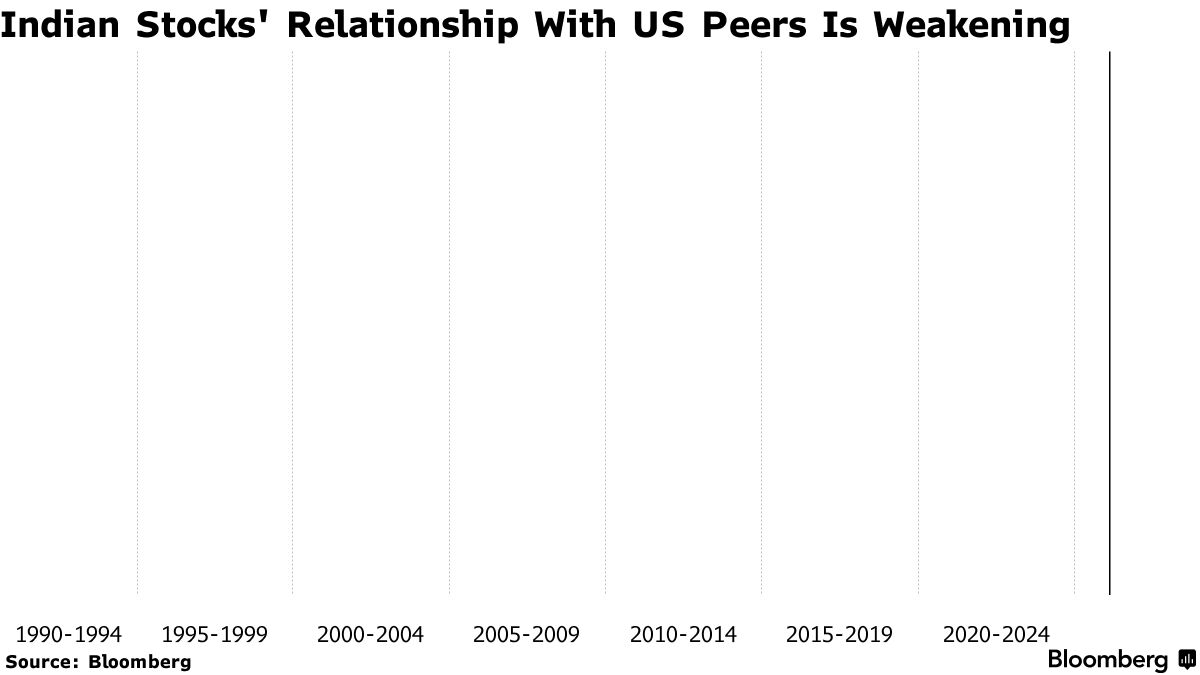 近期印度和美國股市表現的分化突顯了一個更廣泛的趨勢:這兩個市場不再同步波動。Nifty 50指數與標普500指數之間的長期相關性已降至疫情以來的最低水平。儘管去年底美國股市因擔憂南亞國家增長放緩而跑贏印度股市,但這一趨勢現已逆轉,預計關税對美國的影響將大於印度。