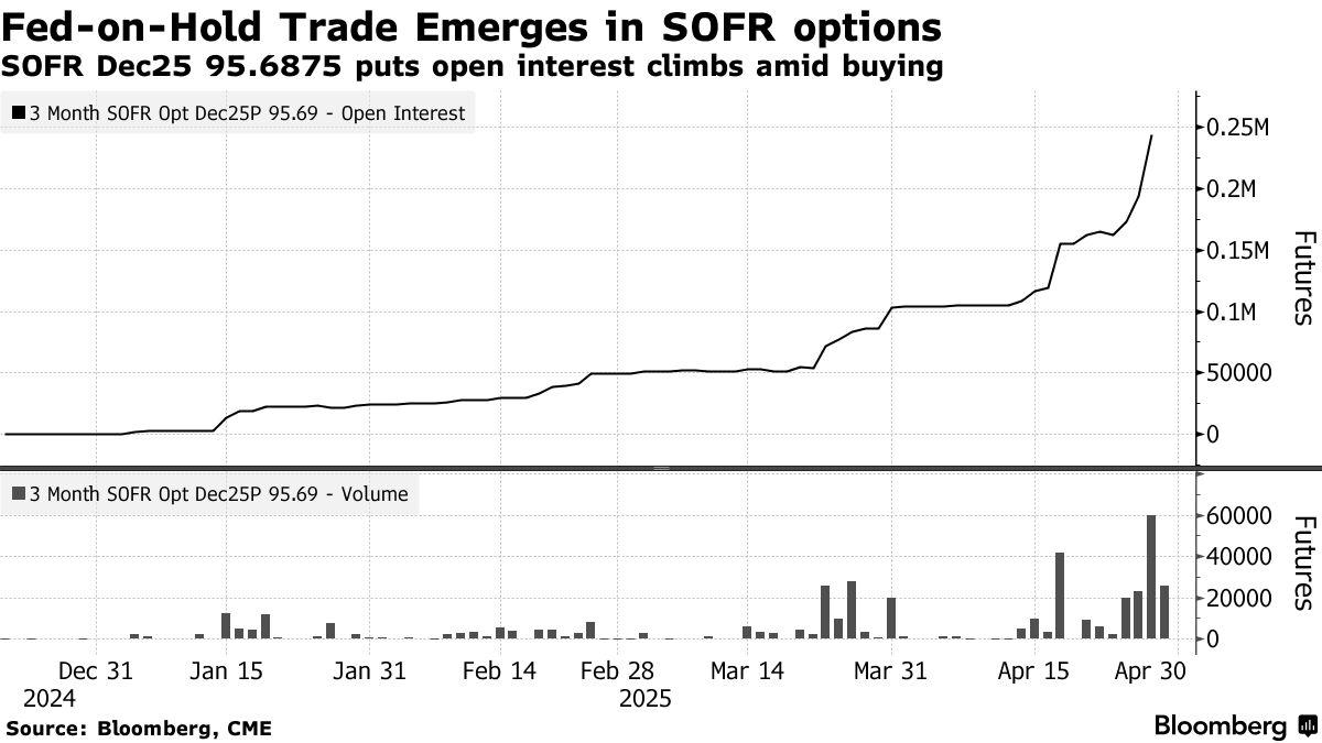 期貨和期權市場的投資者總體上仍預期美聯儲將在7月會議上降息,且今年至少再降息兩次。但過去幾周,一個期權合約的頭寸顯著增加,如果美聯儲在2025年保持利率不變或加息,該合約將獲利。