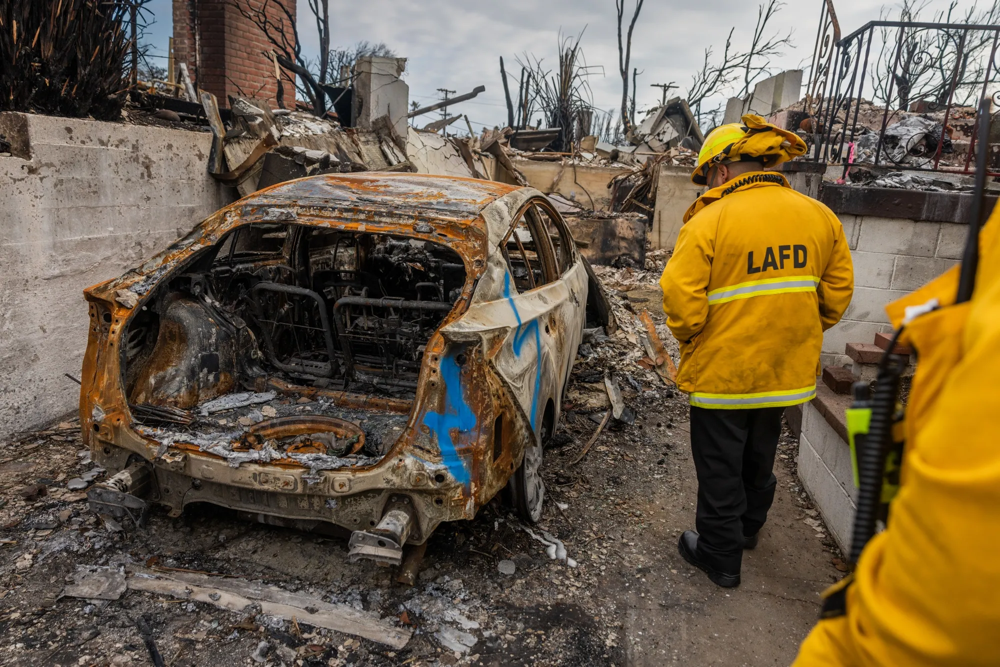 1月30日帕利塞德山火後,洛杉磯消防局工作人員正在檢查一輛被燒燬的車輛。