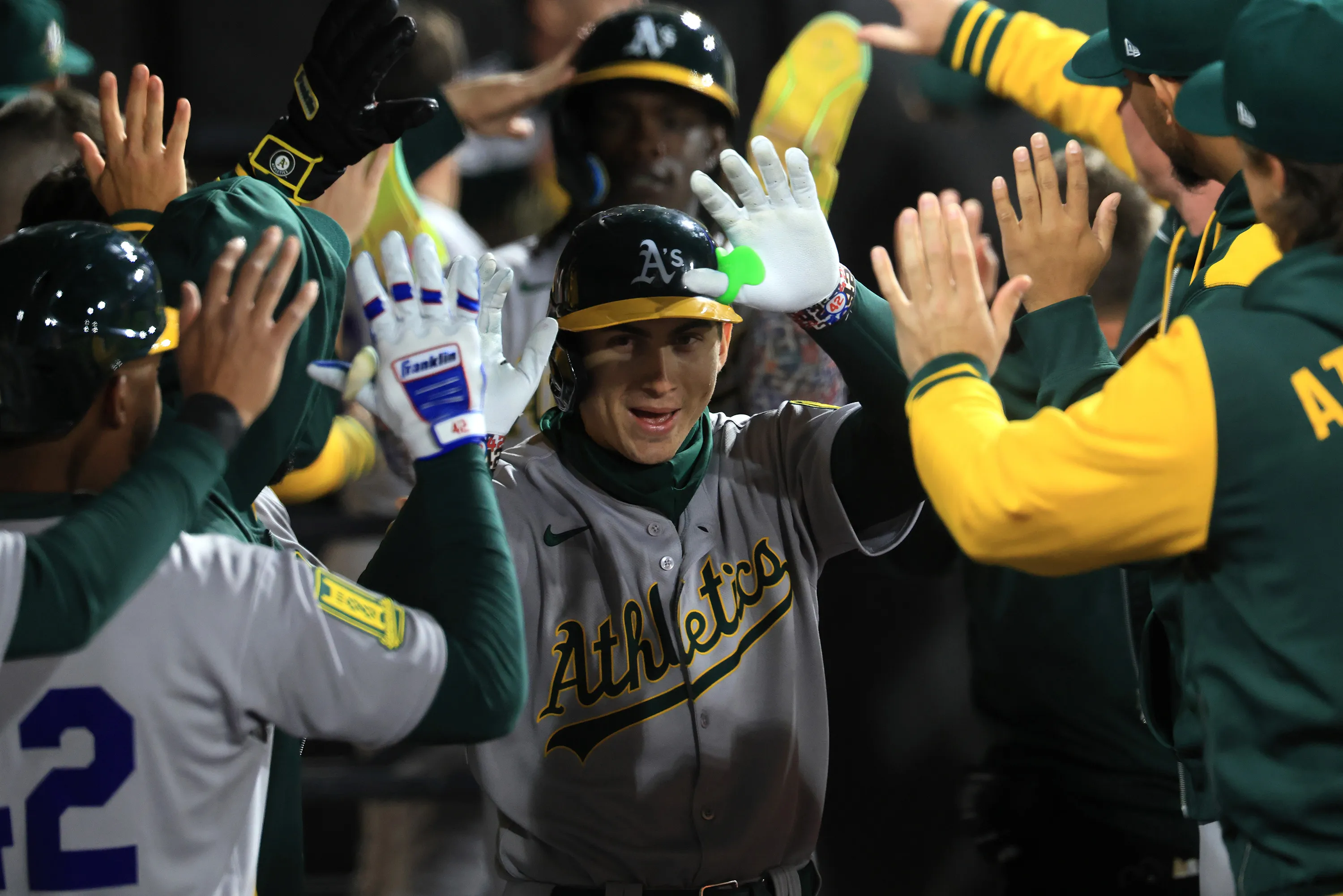 4月15日芝加哥,運動家隊的泰勒·索德斯特羅姆在對陣芝加哥白襪隊時擊出三分本壘打後慶祝。