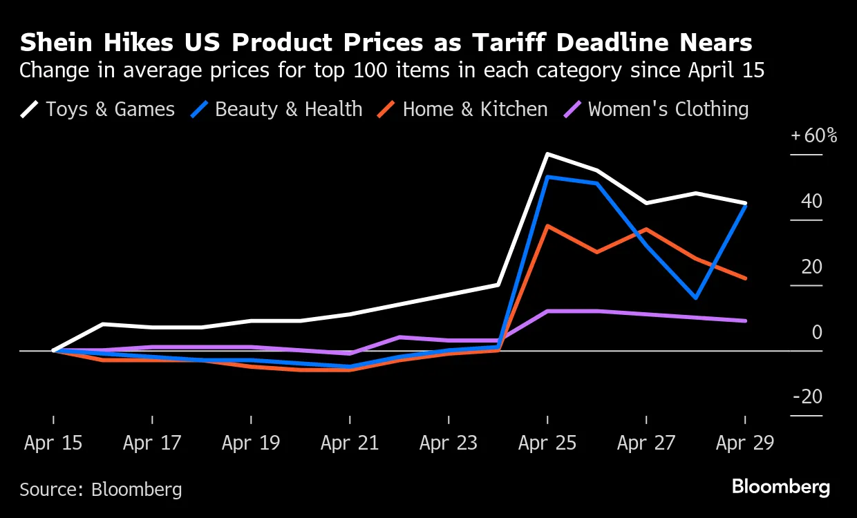 在其競爭對手Shein上,4月29日兩大主要類別——玩具與遊戲、美容與健康——中各自前100名商品的平均價格較前兩週上漲逾40%。家居廚房用品平均價格上漲超20%,而女裝價格上漲9%。