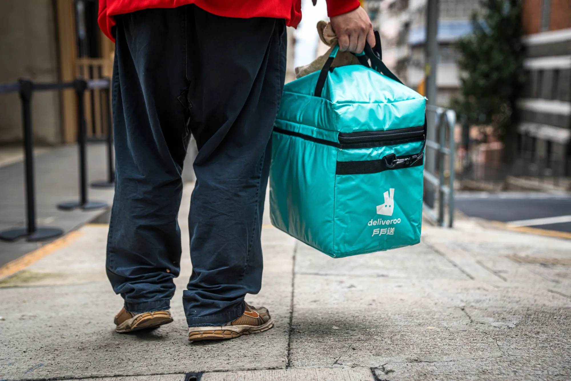 香港一名Deliveroo外賣騎手正攜帶保温配送包。