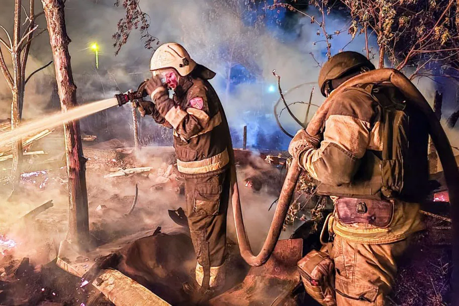 烏克蘭國家緊急服務中心4月29日提供的照片顯示,哈爾科夫市遭俄羅斯無人機襲擊後,消防員正在撲滅大火。