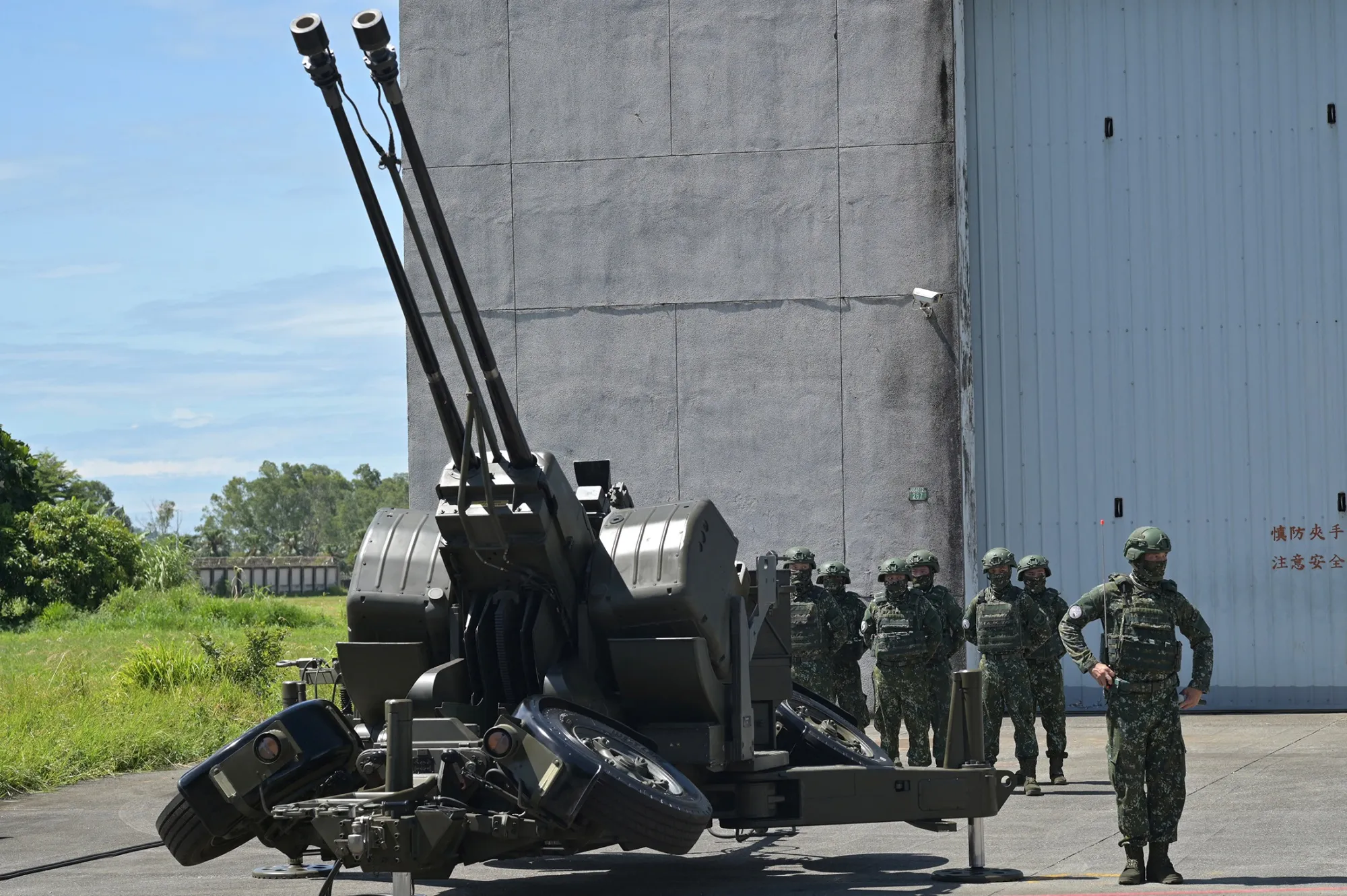 2022年花蓮空軍基地,台灣士兵站在瑞士製造的GDF-006防空炮旁。攝影師:Sam Yeh/AFP/Getty Images即便瑞士通過生產小型部件規避50%規則,政府機構仍警告稱,隨着本國工業技術基礎因日益依賴武器進口而空心化,國家安全將面臨威脅。