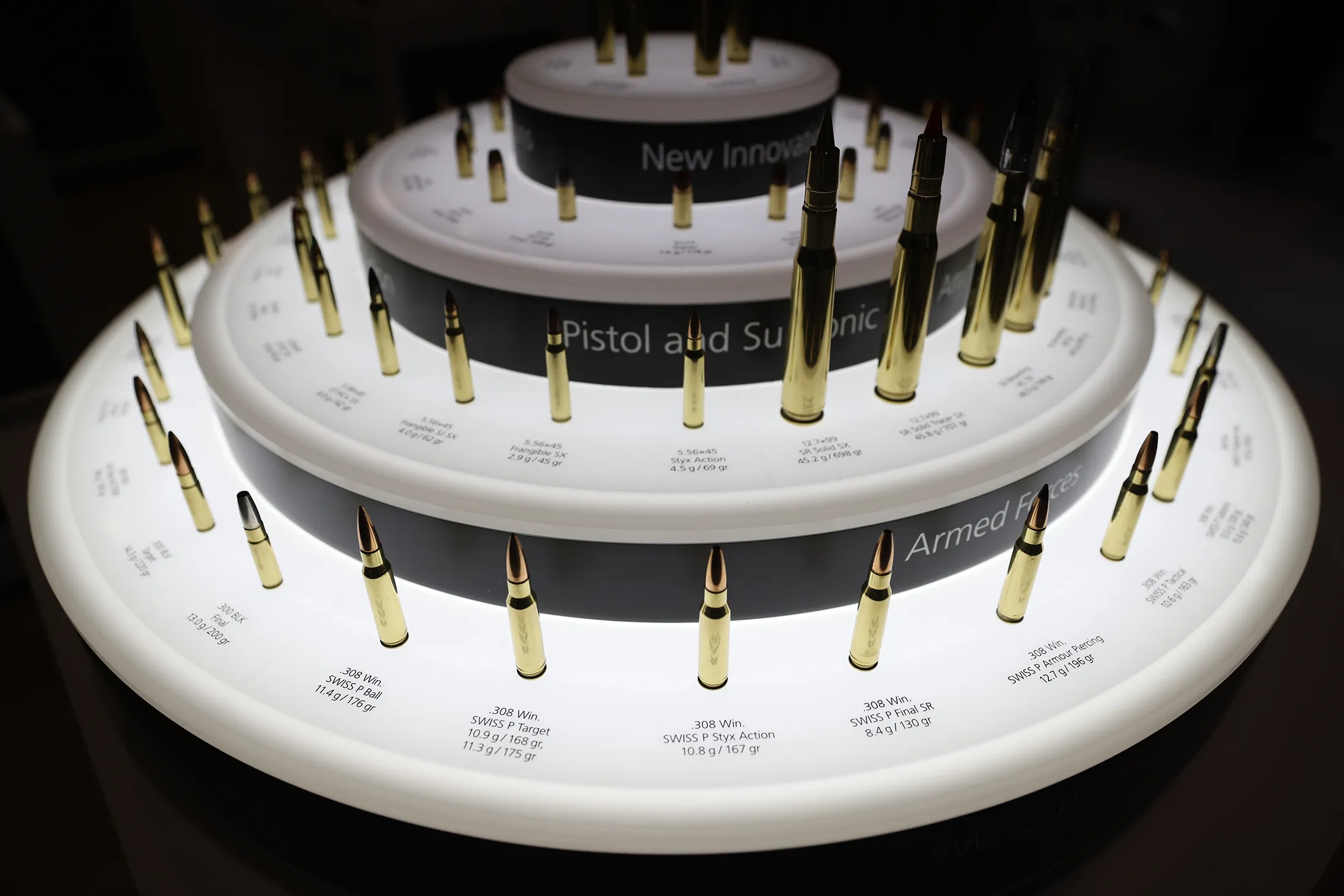 2021年倫敦國際防務與安全裝備展上的瑞士P彈藥展示。