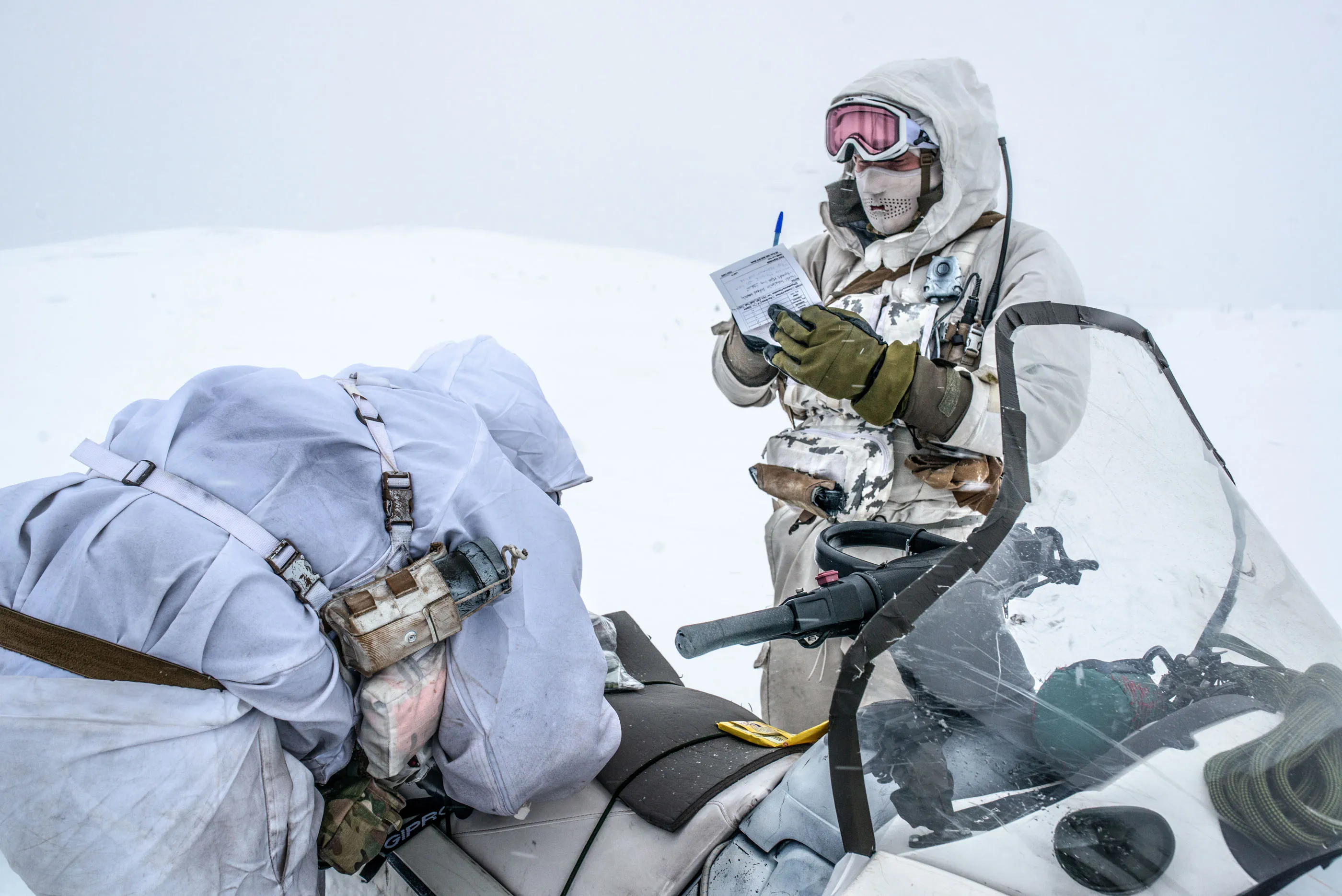 巡邏隊長俯瞰着拉克塞爾夫村附近的荒蕪地貌——這裏位於奧斯陸以北24小時車程處。零下3℃的雪花飄落在纖細的白樺樹上。他和隊友們即將完成百日駐訓,4月30日就能回家。他既好奇體能心理測試會揭示哪些極寒軍事行動的結論,思緒也不禁飄向舒適的家。“能洗個熱水澡就太棒了”,他説。