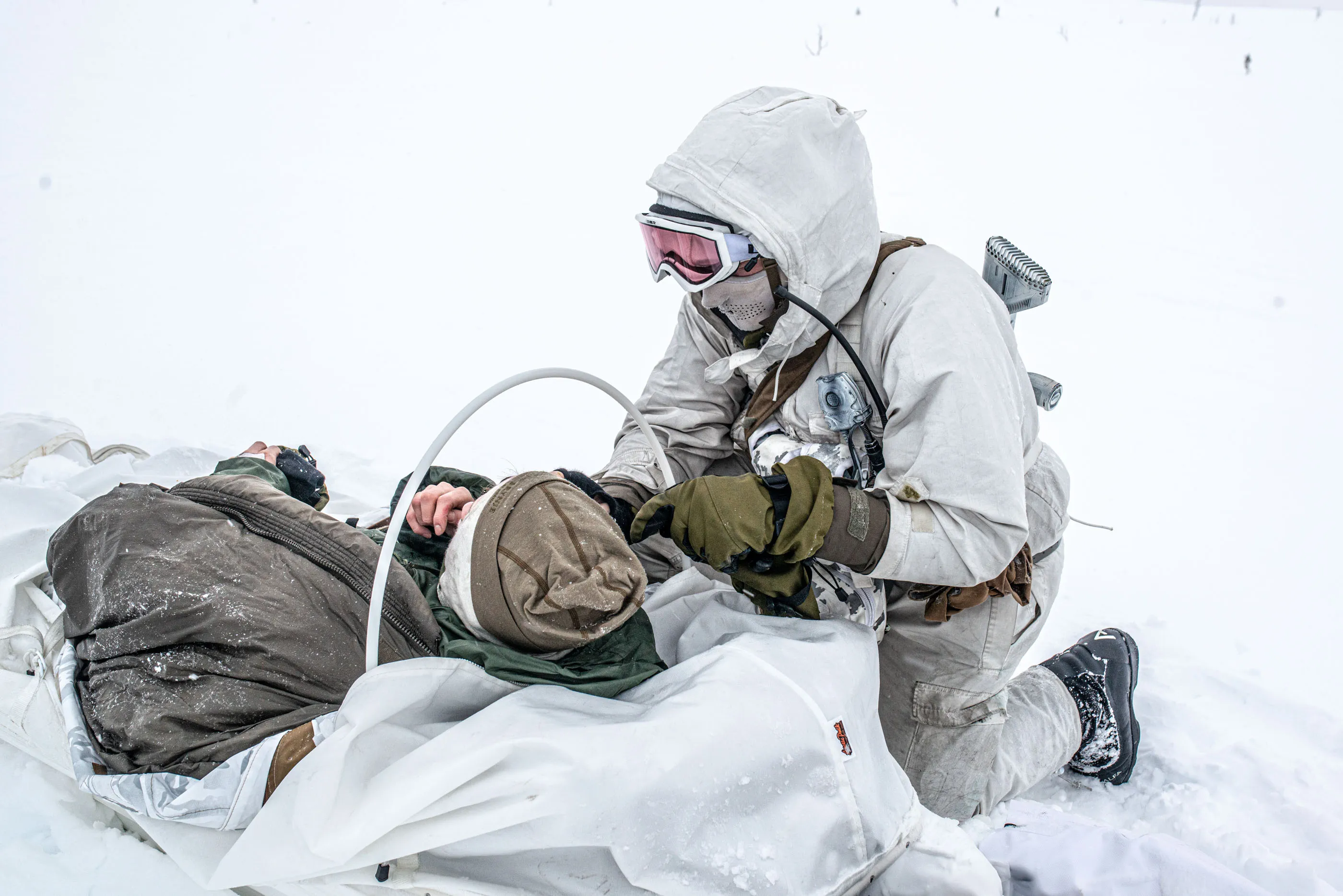 一名士兵正在檢查模擬傷員,該傷員需在北極嚴酷環境下被撤離。攝影:約爾根·梅勞/挪威武裝部隊梅勞表示,極端環境下的傷員處理尤為困難。寒冷天氣中血液難以正常凝固。軍事戰略家從烏克蘭戰爭中吸取教訓:使用直升機撤離傷員並非總是可行——被擊落的風險過高。因此挪威士兵們用雪地摩托拖行載有"傷員”(由志願兵扮演)的雪橇,在51小時內穿越265公里進行撤離演練。