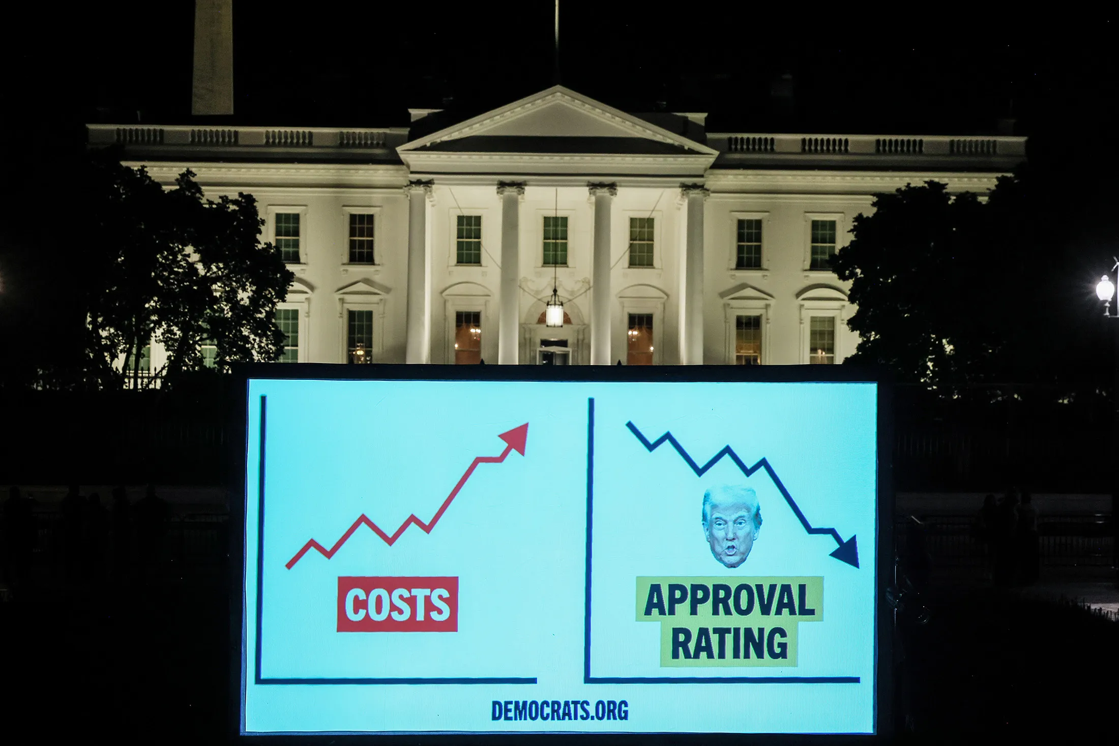週二白宮前的投影顯示不斷上漲的消費成本與特朗普支持率。攝影師:Jemal Countess/Getty Images但這並未引發共和黨內部某些政治專家預期的擔憂。“經濟議題一直是特朗普政治生涯的支柱支持,“共和黨策略師、Firehouse Strategies合夥人亞歷克斯·康南特表示,“如今我們首次看到關税政策導致的信任流失。如果持續到中期選舉時選民對其經濟治理能力失去信心,我們將失去十年來從未失守的選區。”