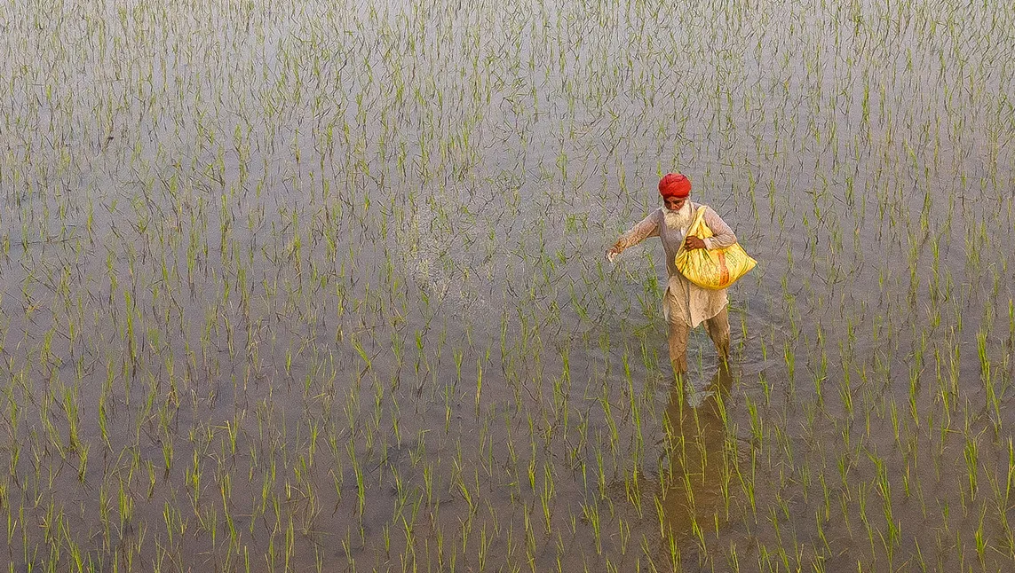 印度旁遮普省西爾西瓦拉村,一名農場工人在田間為水稻秧苗撒肥料。攝影師:Anindito Mukherjee/彭博社印度的農業部門為超過45%的人口提供生計,對GDP的貢獻達16%,至少是美國的三倍以上。