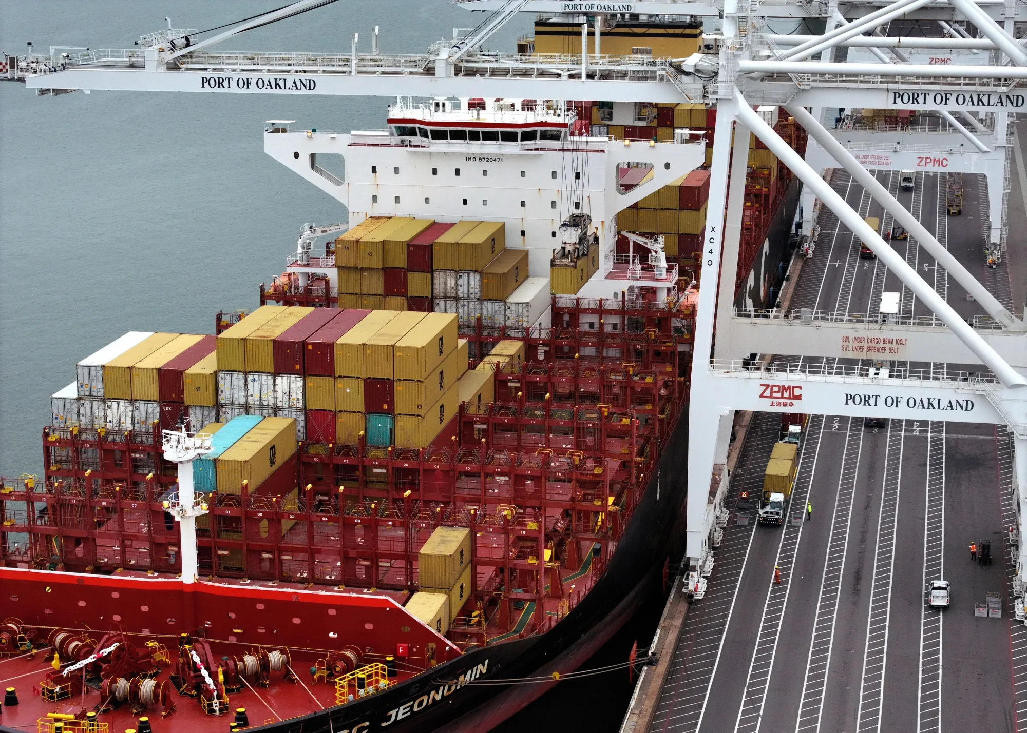 一艘集裝箱船停靠在加利福尼亞州奧克蘭港。攝影師:Justin Sullivan/Getty Images North America**飛機與船舶。**它們共同展現了對關税戰的首批現實反應,這場關税戰旨在重塑美國與其主要貿易伙伴的關係。