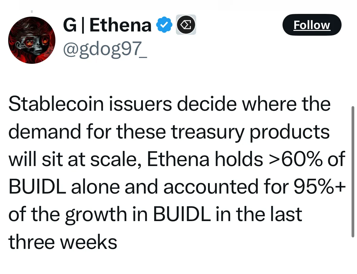 來源:@gdog97_](https://x.com/gdog97_/status/1903823978579263750)“Ethena日益提升的品牌認知度和市場吸引力使其在生態合作伙伴中佔據優勢,”加密貨幣主要經紀商FalconX的市場主管Joshua Lim表示,“它可以將儲備金分配到各種代幣化的國債基金和流動性質押代幣中。同時,作為合格抵押品以及在中心化和去中心化金融平台的交易對上市,Ethena在分銷方面毫無壓力。”