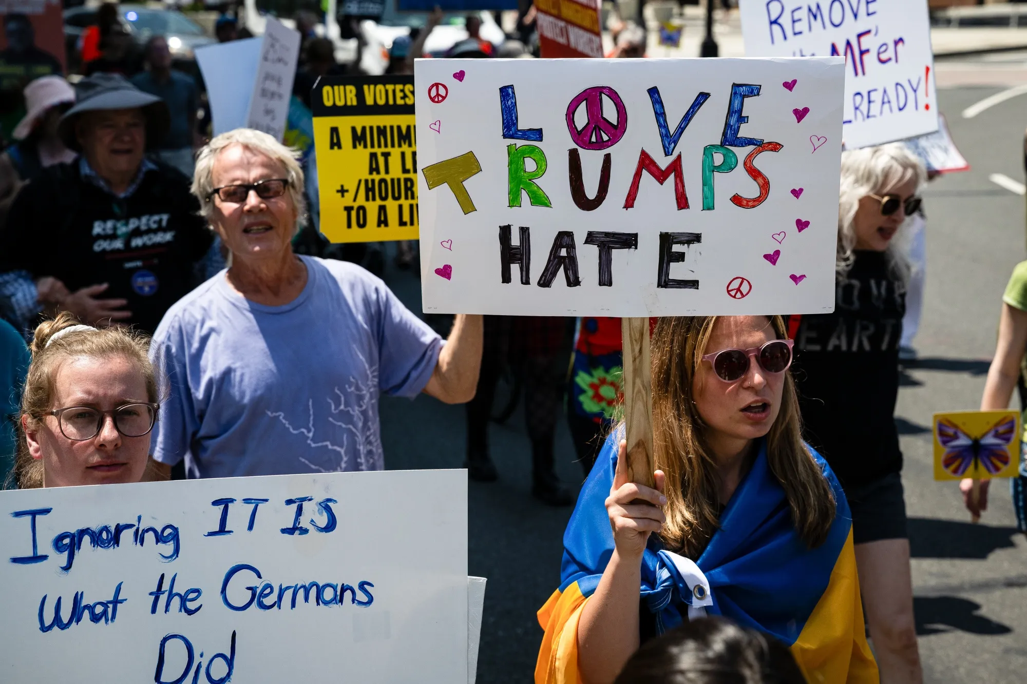週四華盛頓反特朗普政府示威活動中的抗議者。攝影師:Graeme Sloan/Bloomberg美國正考慮放寬對英偉達向阿聯酋銷售芯片的限制。雖然尚未正式決定,但據稱特朗普可能借此次海灣之行宣佈啓動雙邊芯片協議工作。美國商務部和白宮近期正加速討論為阿聯酋修改AI芯片限令,此舉若達成將助力這個海灣國家實現AI雄心——拜登總統任期最後一週頒佈的全球芯片管制政策曾可能制約其發展。