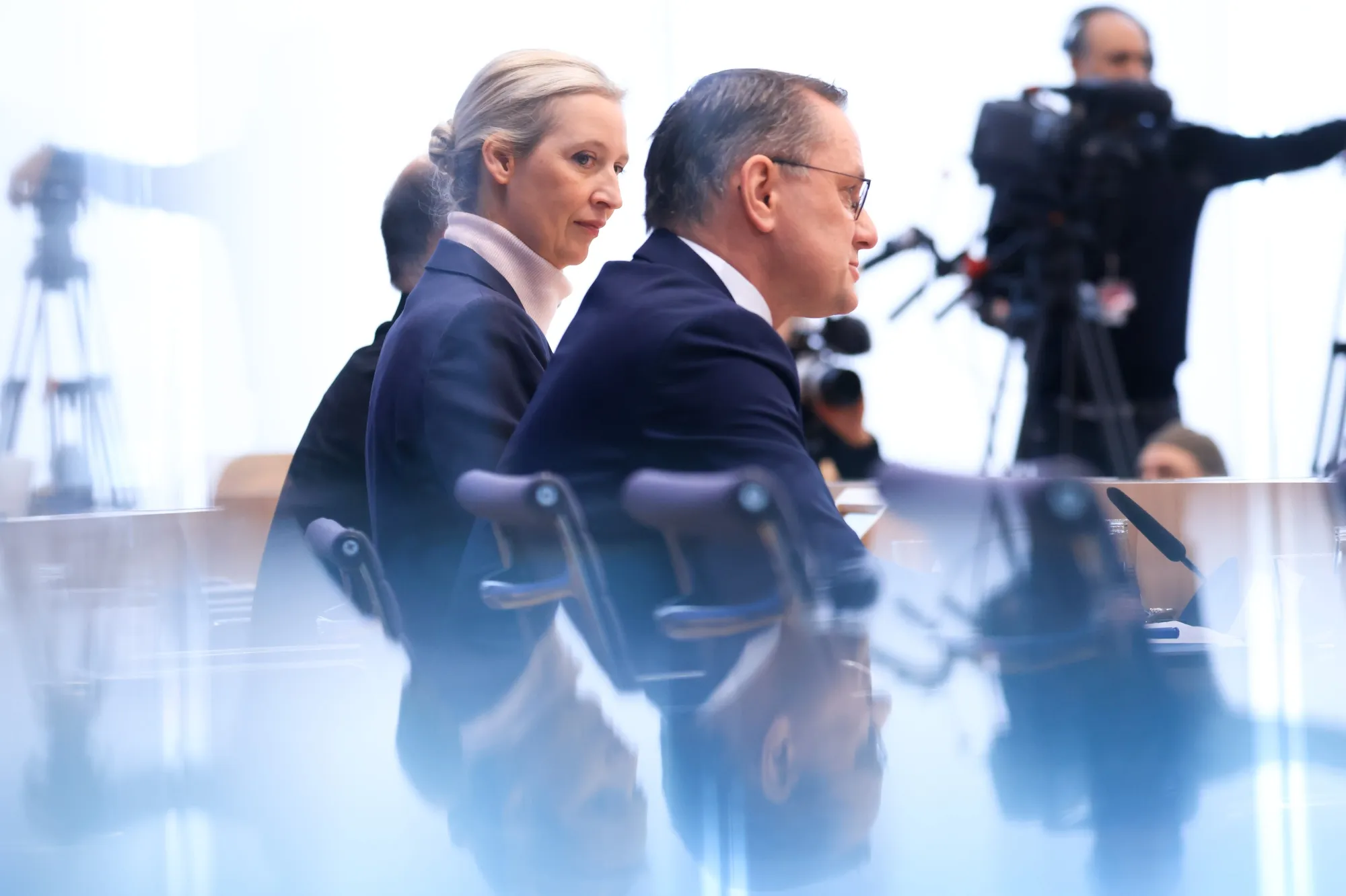 德國選擇黨聯合主席愛麗絲·魏德爾和蒂諾·克魯帕拉。攝影師:克里斯蒂安·博奇/彭博社德國選擇黨已獲得特斯拉公司首席執行官兼唐納德·特朗普顧問埃隆·馬斯克的支持,在一些民調中領先於由即將上任的總理弗里德里希·默茨領導的保守派陣營,默茨定於週二就職。