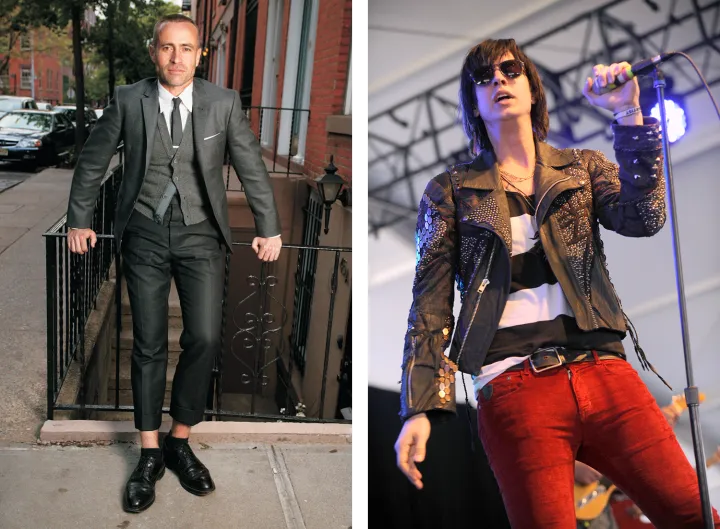 左圖:2006年的Browne。他的設計讓男裝經歷了一場"熱洗烘乾”。右圖:The Strokes樂隊主唱Julian Casablancas在2010年科切拉音樂節表演。攝影:Stephen Sullivan/Getty Images 和 Tim Mosenfelder/Getty Images最早追隨修身剪裁風潮的是崇尚時尚的都市青年,他們擁抱這種源自歐洲的青春酷感美學。這些人穿着窄版西裝外套,使用含洋甘菊提取物的保濕霜,還能清晰分辨切爾西靴與喬德普爾靴的區別。