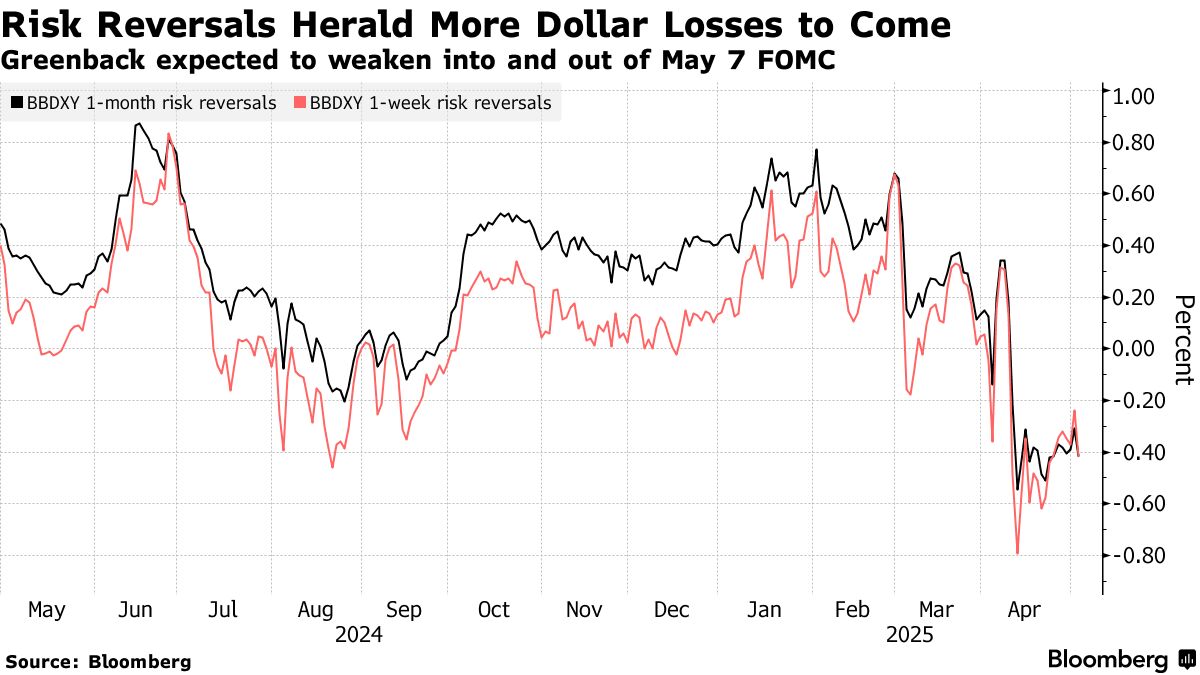 彭博美元即期指數的一週和一個月風險逆轉均指向市場預期美元將在5月7日美聯儲利率決定前後進一步走軟。交易員們仍更願意為押注美元走弱的看跌期權支付更高費用,而非押注美元在未來一週或一個月上漲的看漲期權。