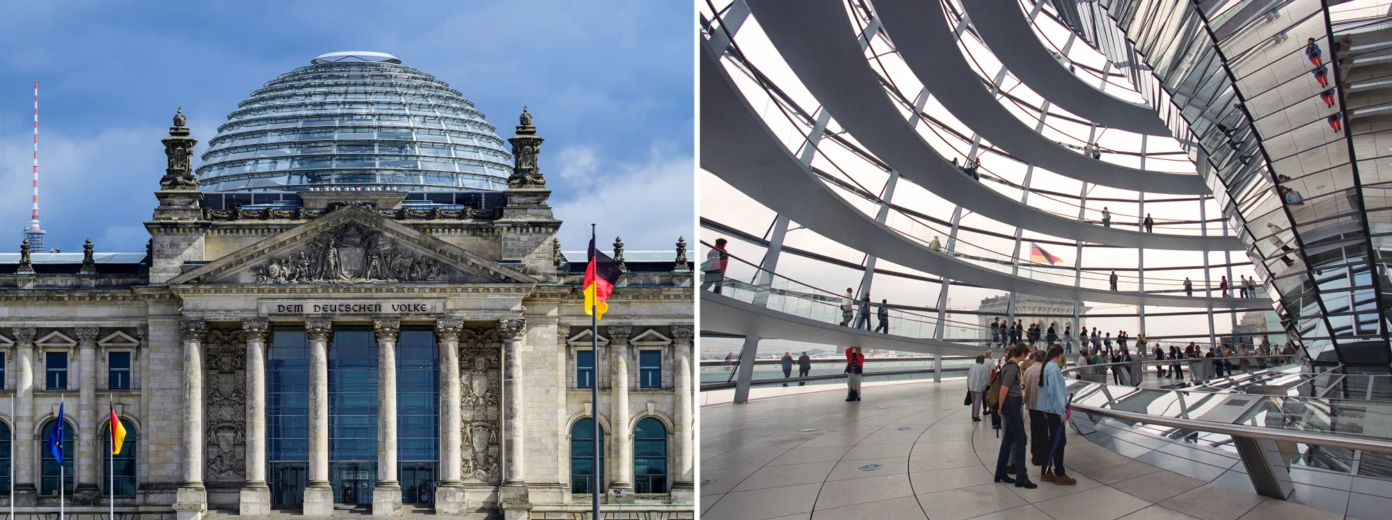 左上順時針方向:劍橋大學塞爾温學院安斯庭院(德米特里·波菲里奧斯設計,2005/2009年);倫敦皇家空軍轟炸機司令部紀念碑(利亞姆·奧康納設計,2012年);伯明翰布林德利廣場三號(德米特里·波菲里奧斯設計,1998年);倫敦國王畫廊(約翰·辛普森設計,2002年)。來源:View Pictures/UIP/Getty Images;蒂姆·拉德馬赫,CC BY-SA 4.0;託尼·希斯蓋特,CC BY 2.0;馬特·布朗,CC BY 2.0確實,很難找到比諾曼·福斯特勳爵在柏林飽受戰爭創傷的國會大廈上加建的玻璃穹頂更兼具新古典與現代風格的設計: