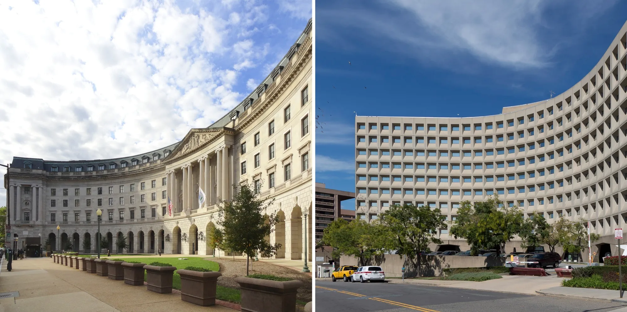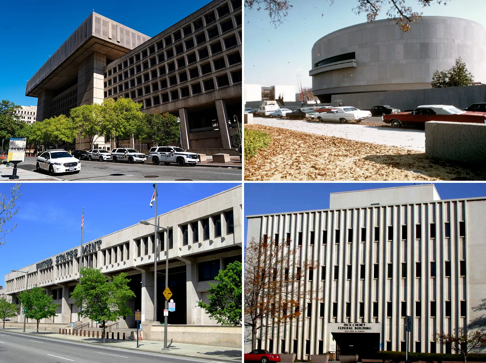 威廉·傑斐遜·克林頓聯邦大樓(德拉諾與奧爾德里奇設計,1934年);羅伯特·C·韋弗聯邦大樓(馬塞爾·布勞耶設計,1968年)。來源:Moreau1,公有領域;卡羅爾·M·海史密斯檔案館,總務管理局左側是位於華盛頓的威廉·傑斐遜·克林頓聯邦大樓,建於1934年,並於1990年代內外修復。右側是同樣位於首都的羅伯特·C·韋弗聯邦大樓,竣工於1968年。調查結果:1