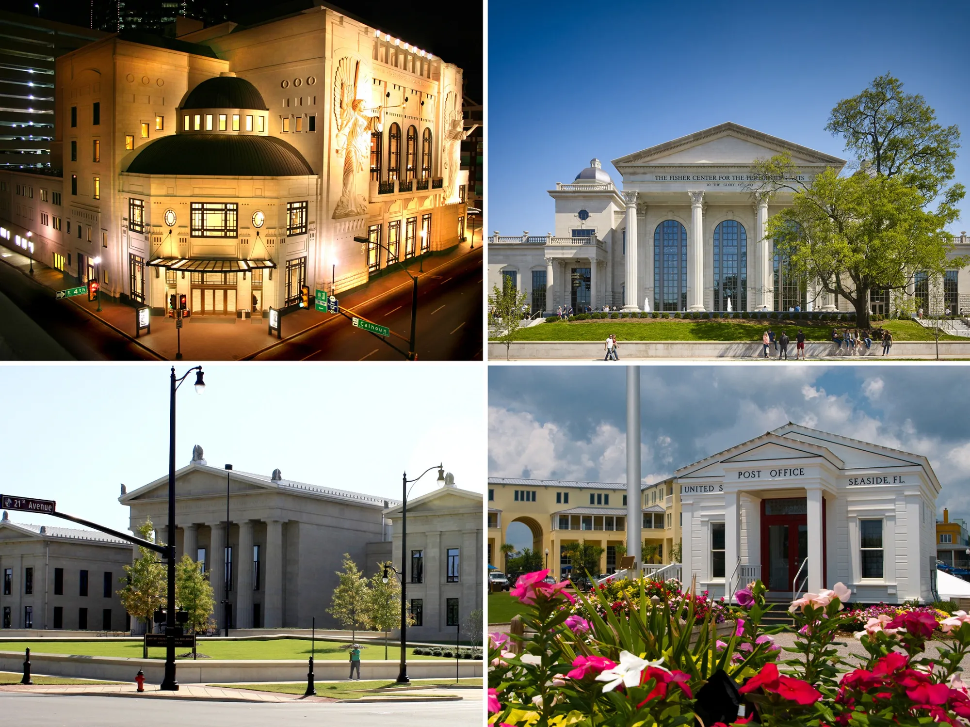 左上順時針方向:沃斯堡巴斯表演藝術廳(David M. Schwarz,1998);貝爾蒙特大學費舍爾表演藝術中心,納什維爾(Earl Swensson聯合設計,2021);佛羅里達州海濱美國郵局(Robert Davis/DPZ建築事務所,1985);阿拉巴馬州塔斯卡盧薩聯邦大樓及法院(HBRA建築事務所,2011)。來源:英文維基百科Phlyr,CC BY-SA 3.0;貝爾蒙特大學Sam Simpkins;paigeh,CC BY-SA 2.5;Deutschlandreform,CC BY-SA 3.0必要時,或許還可納入達拉斯更具現代主義風格的喬治·W·布什總統中心,由0.001%階層的非官方建築師羅伯特·A·M·斯特恩設計(2013年):