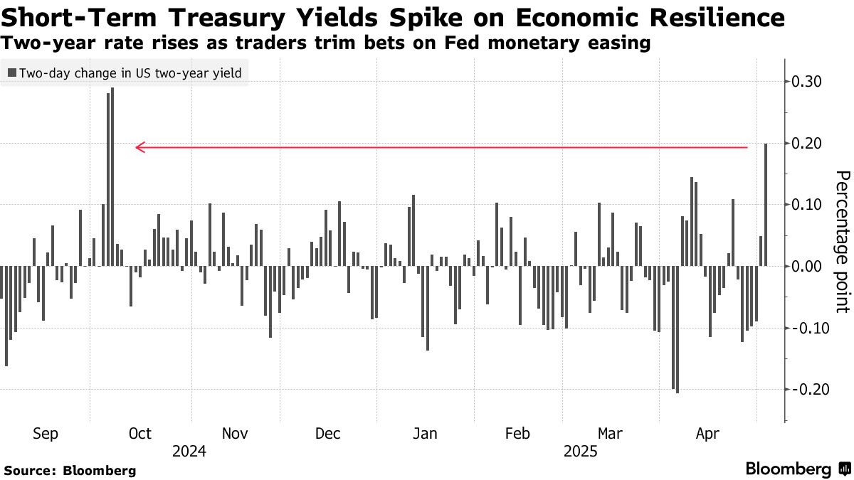 在大量買入短期國債(預期美聯儲最早將於下月開始放鬆政策以遏制衝擊)後,他們迅速轉向。兩年期國債收益率大幅飆升,創下自去年10月以來最大兩日漲幅,期貨交易員開始消化美聯儲官員一直試圖強調的觀點——他們將保持觀望模式,直到有更多證據表明經濟出現轉向。