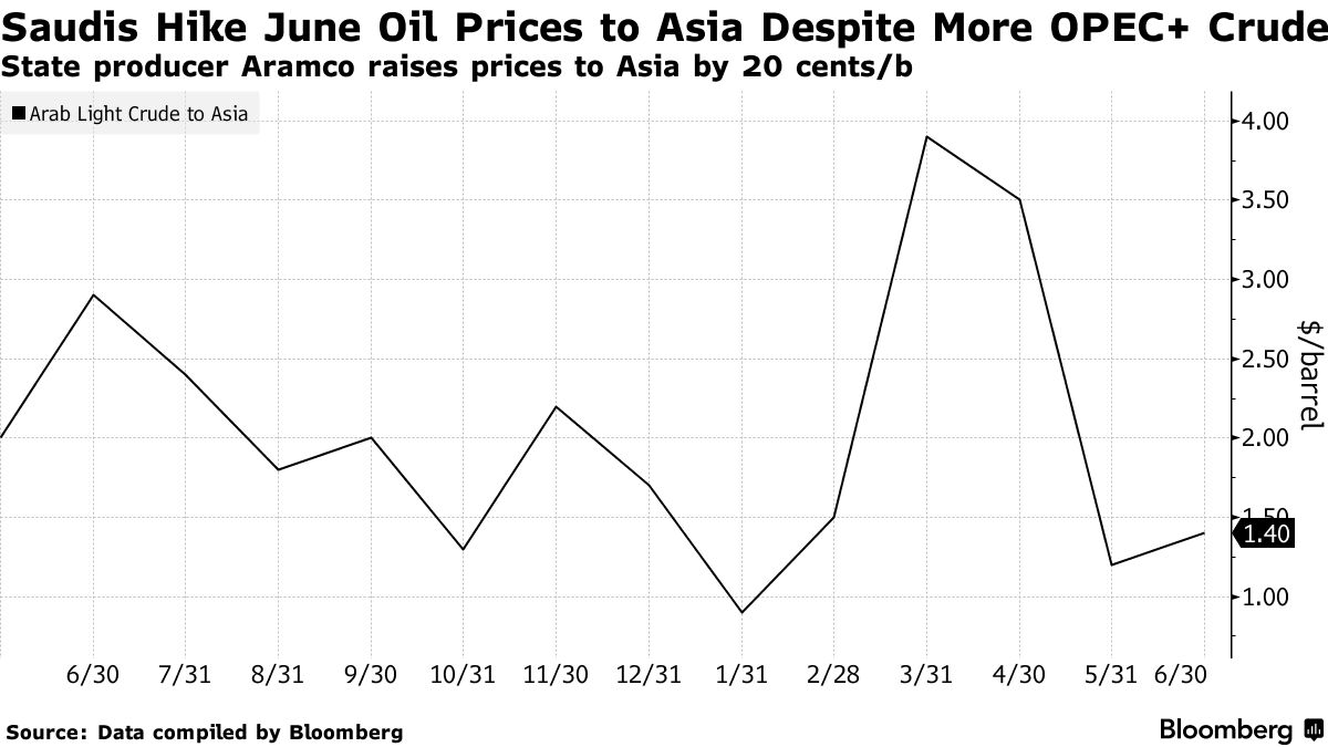 沙特阿拉伯在下個月對亞洲買家的原油價格進行了上調,儘管歐佩克+宣佈6月將再次超預期增產。