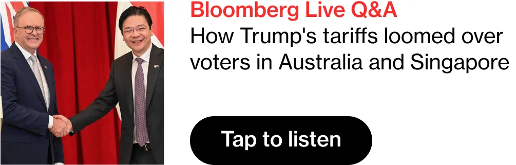 特朗普關税陰影如何籠罩澳大利亞與新加坡選民。收聽我們的即時問答錄音,彭博社的海迪·斯特勞德-瓦茨、德里克·沃爾班克、菲利普·海傑曼斯和本·韋斯科特將討論美國總統對兩場週末選舉的影響——這兩場選舉鞏固了現任者的地位。