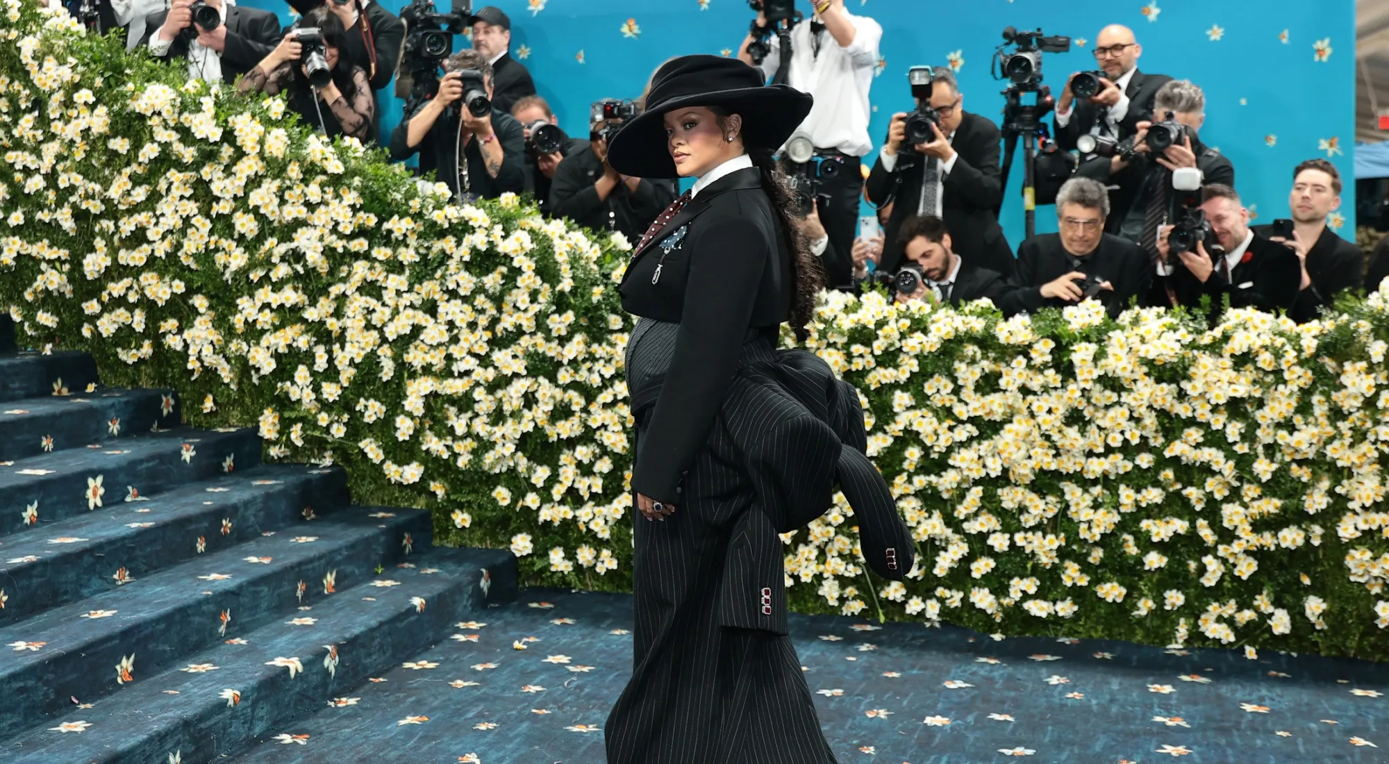 蕾哈娜出席2025年Met Gala盛典。攝影師:Dimitrios Kambouris/Getty Images在這場具有歷史意義的Met Gala盛會上,眾多新聞瞬間中,蕾哈娜與A$AP洛基再次以宣佈懷上第三胎的喜訊成為焦點。洛基是2025年Met Gala男裝主題"極致:剪裁黑色風尚"的聯合主席之一。
