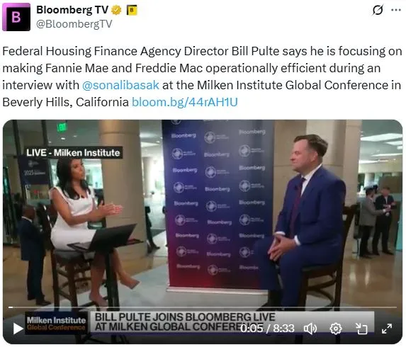 今天,彭博電視台的權力平衡節目下午1點的早間版,主持人David Gura將帶來Sonali Basak對聯邦住房金融局局長Bill Pulte的採訪,討論房利美和房地美的未來。