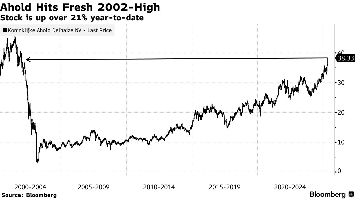 Stop & Shop超市所有者在美國的可比銷售額增長3.1%,超出預期,而該市場高度關注的基本營業利潤率如預期達到4.4%。歐洲強勁的銷售表現也提振了其業績,公司股票在阿姆斯特丹早盤交易中最高上漲5.9%,延續近期漲勢至2002年1月以來的最高點。