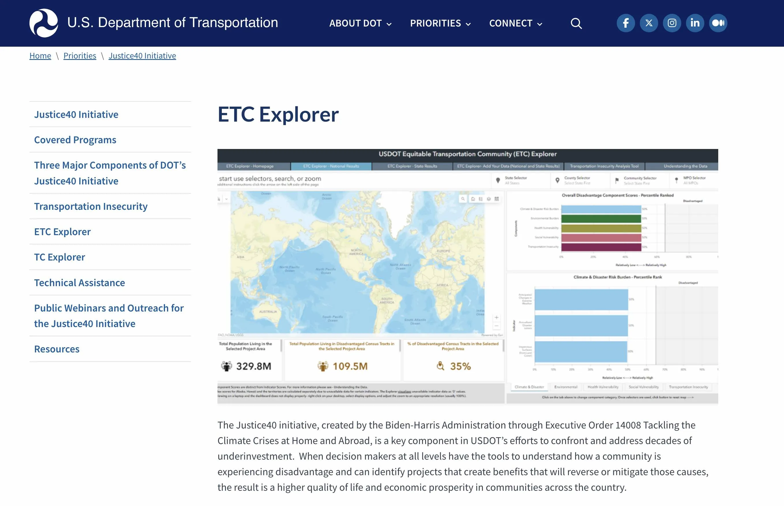 交通部公平交通社區探索工具的存檔版本來源:網頁時光機另一項具有環境正義傾向的拜登時代測繪工具——交通部公平交通社區探索器,曾用於識別交通投資不足的社區。塞拉俱樂部利用該工具推動市政部門更好地宣傳現有綠地資源,並立法改善服務不足社區與步道、公園等公共區域之間的公共交通連接。今年早些時候撤銷該地圖的特朗普政府交通部未回應置評請求。該工具的舊版主頁仍存於網頁時光機。