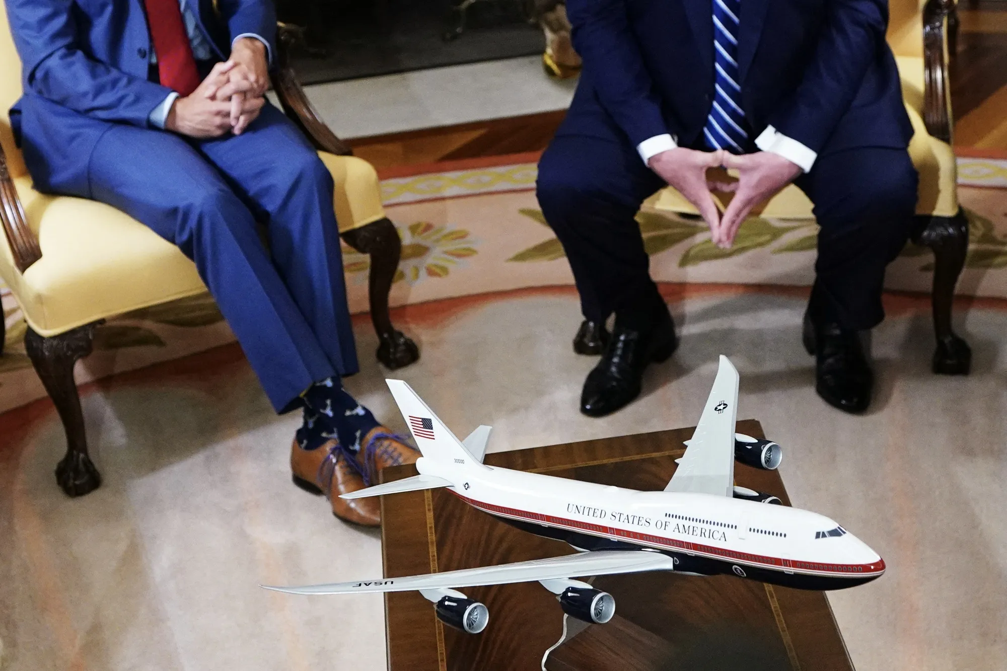 2019年橢圓形辦公室內展示採用新塗裝方案的空軍一號模型。攝影師:Mandel Ngan/AFP/Getty Images美國空軍官員表示,隨着特朗普總統對在第二任期結束前獲得重新設計的專機愈發失去耐心,空軍正全力加速新空軍一號的交付進程。