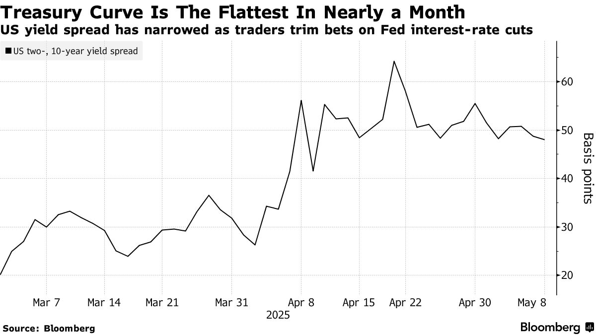 對政策敏感的兩年期利率攀升4個基點至3.82%,與10年期國債的利差縮小至48個基點,接近一個月來的最小水平。鮑威爾週三表示,央行在採取行動前需要更多關於貿易政策方向的確定性。